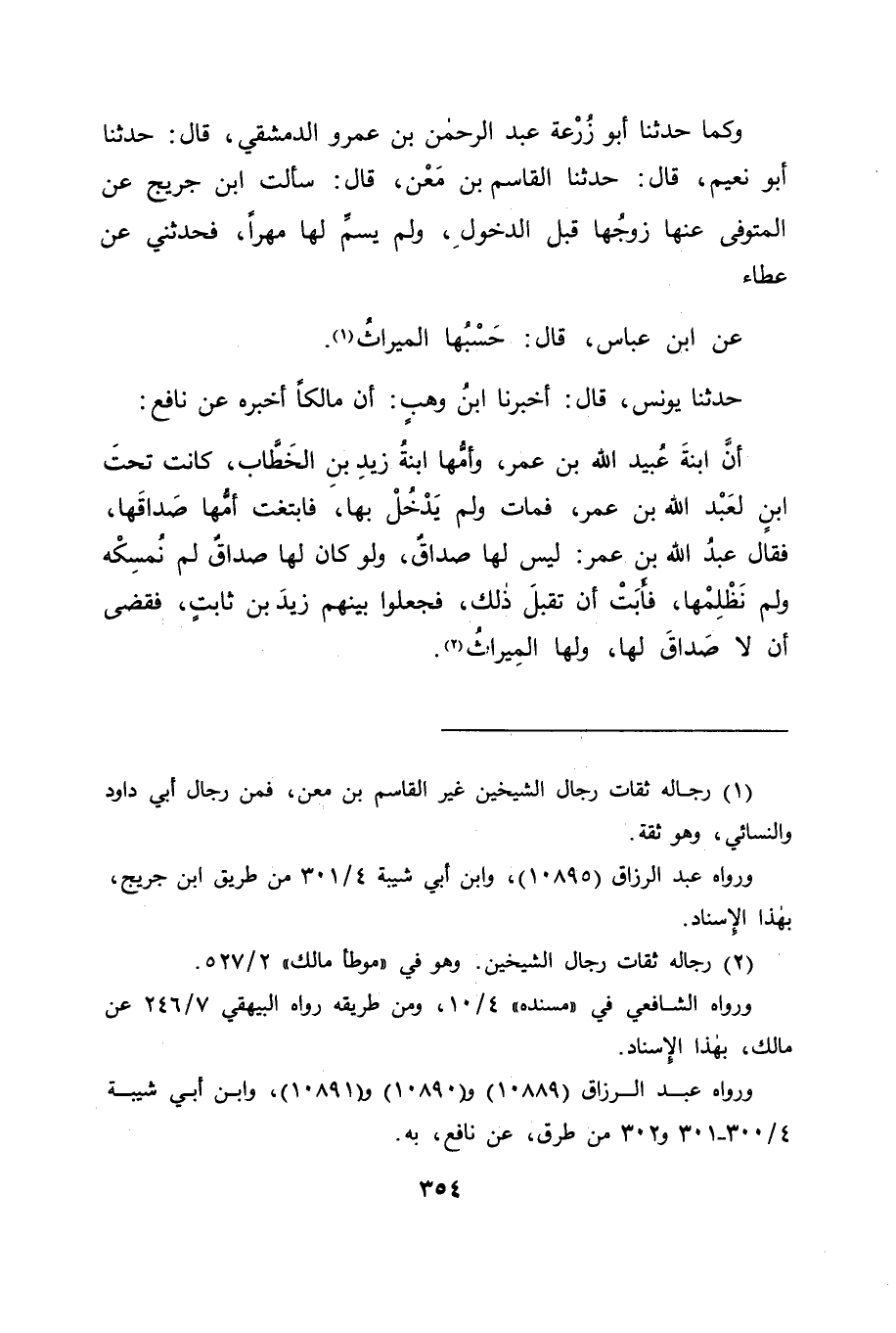 وَكَمَا حَدَّثَنَا أَبُو زُرْعَةَ عَبْدُ الرَّحْمَنِ بْنُ عَمْرٍو الدِّمَشْقِيُّ قَالَ: حَدَّثَنَا أَبُو نُعَيْمٍ قَالَ: حَدَّثَنَا الْقَاسِمُ بْنُ مَعْنٍ قَالَ: سَأَلْتُ ابْنَ جُرَيْجٍ عَنِ الْمُتَوَفَّى عَنْهَا زَوْجُهَا قَبْلَ الدُّخُولِ وَلَمْ يُسَمِّ لَهَا مَهْرًا، فَحَدَّثَنِي عَنْ عَطَاءٍ، عَنِ ابْنِ عَبَّاسٍ قَالَ: " حَسْبُهَا الْمِيرَاثُ "