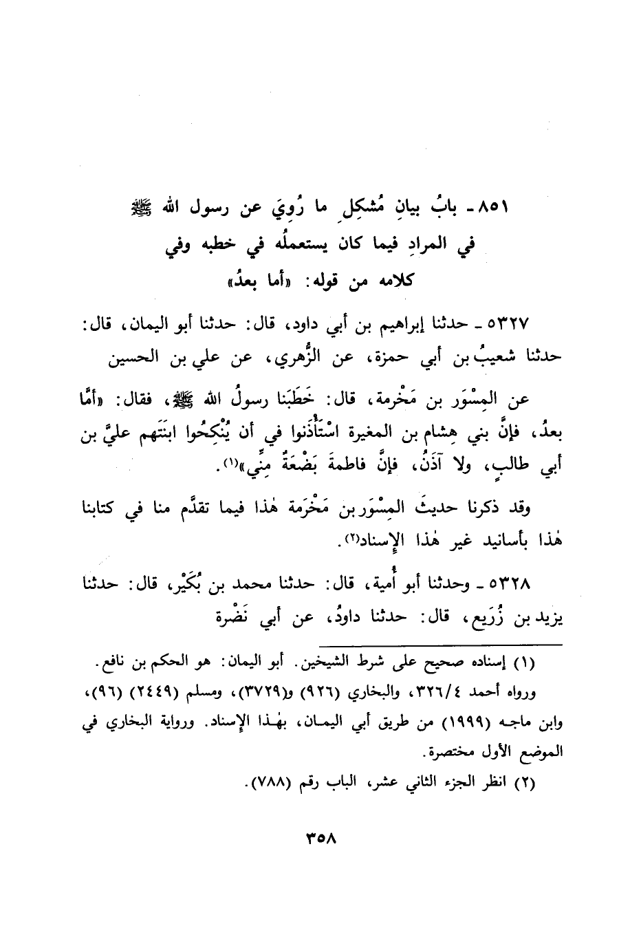 5327 - حَدَّثَنَا إِبْرَاهِيمُ بْنُ أَبِي دَاوُدَ قَالَ: حَدَّثَنَا أَبُو الْيَمَانِ قَالَ: حَدَّثَنَا شُعَيْبُ بْنُ أَبِي حَمْزَةَ، عَنِ الزُّهْرِيِّ، عَنْ عَلِيِّ بْنِ الْحُسَيْنِ، عَنِ الْمِسْوَرِ بْنِ مَخْرَمَةَ قَالَ: " " خَطَبَنَا رَسُولُ اللهِ صَلَّى اللَّهُ عَلَيْهِ وَسَلَّمَ، فَقَالَ: " " أَمَّا بَعْدُ، فَإِنَّ بَنِي هِشَامِ بْنِ الْمُغِيرَةِ اسْتَأْذَنُوا فِي أَنْ يُنْكِحُوا ابْنَتَهُمْ عَلِيَّ بْنَ أَبِي طَالِبٍ، وَلَا آذَنُ؛ فَإِنَّ فَاطِمَةَ بَضْعَةٌ مِنِّي " " وَقَدْ ذَكَرْنَا حَدِيثَ الْمِسْوَرِ بْنِ مَخْرَمَةَ هَذَا فِيمَا تَقَدَّمَ مِنَّا فِي كِتَابِنَا هَذَا بِأَسَانِيدَ غَيْرِ هَذَا الْإِسْنَادِ