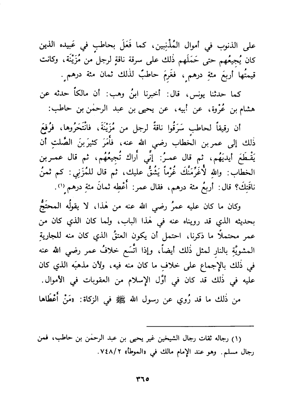 كَمَا حَدَّثَنَا يُونُسُ قَالَ: أَخْبَرَنَا ابْنُ وَهْبٍ: أَنَّ مَالِكًا حَدَّثَهُ عَنْ هِشَامِ بْنِ عُرْوَةَ، عَنْ أَبِيهِ، عَنْ يَحْيَى بْنِ عَبْدِ الرَّحْمَنِ بْنِ حَاطِبٍ: " أَنَّ رَقِيقًا لِحَاطِبٍ سَرَقُوا نَاقَةً لِرَجُلٍ مِنْ مُزَيْنَةَ، فَانْتَحَرُوهَا، فَرُفِعَ ذَلِكَ إِلَى عُمَرَ بْنِ الْخَطَّابِ رَضِيَ اللهُ عَنْهُ، فَأَمَرَ كَثِيرَ بْنَ الصَّلْتِ أَنْ يَقْطَعَ أَيْدِيَهُمْ، ثُمَّ قَالَ عُمَرُ: إِنِّي أَرَاكَ تُجِيعُهُمْ، ثُمَّ قَالَ عُمَرُ بْنُ الْخَطَّابِ: وَاللهِ لَأُغَرِّمَنَّكَ غُرْمًا يَشُقُّ عَلَيْكَ، ثُمَّ قَالَ لِلْمُزَنِيِّ: كَمْ ثَمَنُ نَاقَتِكَ؟ قَالَ: أَرْبَعُمِائَةِ دِرْهَمٍ، فَقَالَ عُمَرُ: أَعْطِهِ ثَمَانِمِائَةِ دِرْهَمٍ " وَكَانَ مَا كَانَ عَلَيْهِ عُمَرُ رَضِيَ اللهُ عَنْهُ مِنْ هَذَا، لَا يَقُولُهُ الْمُحْتَجُّ بِحَدِيثِهِ الَّذِي قَدْ رُوِّينَاهُ عَنْهُ فِي هَذَا الْبَابِ وَلَمَّا كَانَ الَّذِي كَانَ مِنْ عُمَرَ مُحْتَمِلًا مَا ذَكَرْنَا، احْتَمَلَ أَنْ يَكُونَ الْعِتْقُ الَّذِي كَانَ مِنْهُ لِلْجَارِيَةِ الْمَشْوِيَّةِ بِالنَّارِ لِمِثْلِ ذَلِكَ أَيْضًا، وَإِذَا اتَّسَعَ خِلَافُ عُمَرَ رَضِيَ اللهُ عَنْهُ فِي ذَلِكَ بِالْإِجْمَاعِ عَلَى خِلَافِ مَا كَانَ مِنْهُ فِيهِ، وَلِأَنَّ مَذْهَبَهُ الَّذِي كَانَ عَلَيْهِ فِي ذَلِكَ قَدْ كَانَ فِي أَوَّلِ الْإِسْلَامِ مِنَ الْعُقُوبَاتِ فِي الْأَمْوَالِ مِنْ ذَلِكَ مَا قَدْ رُوِيَ عَنْ رَسُولِ اللهِ صَلَّى اللَّهُ عَلَيْهِ وَسَلَّمَ فِي الزَّكَاةِ: " مَنْ أَعْطَاهَا -[366]- مُؤْتَجِرًا، قَبِلْنَاهَا مِنْهُ، وَإِلَّا فَإِنَّا آخِذُوهَا وَشَطْرَ مَالِهِ، عَزْمَةً مِنْ عَزَمَاتِ رَبِّنَا " وَمِنْ ذَلِكَ مَا رُوِيَ عَنْهُ فِيمَنْ وَقَعَ عَلَى جَارِيَةِ امْرَأَتِهِ مُسْتَكْرَهًا لَهَا، أَوْ غَيْرَ مُسْتَكْرِهٍ لَهَا، مِمَّا سَنَذْكُرُهُ مِنْ بَعْدُ فِي كِتَابِنَا هَذَا إِنْ شَاءَ اللهُ وَإِذَا وَجَبَ نَسْخُ ذَلِكَ وَاسْتِعْمَالُ ضِدِّهِ، كَانَ مِثْلُ ذَلِكَ أَيْضًا مِنَ الْعُقُوبَاتِ فِي الْأَمْوَالِ بِالْمَثُلَاتِ، وَغَيْرِهَا يَكُونُ مِثْلَ ذَلِكَ، وَتَكُونُ الْعُقُوبَاتُ تُرَدُّ إِلَى أَمْثَالِهَا، وَتُرِكَ أَخْذُ مَا سِوَاهَا بِهَا ثُمَّ رَجَعْنَا إِلَى مَا يُرْوَى عَنْ رَسُولِ اللهِ مِمَّا يَدْخُلُ فِي هَذَا الْبَابِ