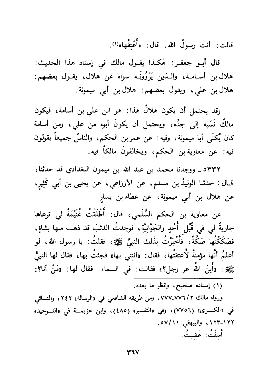5332 - وَوَجَدْنَا مُحَمَّدَ بْنَ عَبْدِ اللهِ بْنِ مَيْمُونٍ الْبَغْدَادِيَّ قَدْ حَدَّثَنَا قَالَ: حَدَّثَنَا الْوَلِيدُ بْنُ مُسْلِمٍ، عَنِ الْأَوْزَاعِيِّ، عَنْ يَحْيَى بْنِ أَبِي كَثِيرٍ، عَنْ هِلَالِ بْنِ أَبِي مَيْمُونَةَ، عَنْ عَطَاءِ بْنِ يَسَارٍ، عَنْ مُعَاوِيَةَ بْنِ الْحَكَمِ السُّلَمِيِّ قَالَ: " أَطْلَقْتُ غُنَيْمَةً لِي تَرْعَاهَا جَارِيَةٌ لِي فِي قِبَلِ أُحُدٍ، وَالْجَوَّانِيَّةِ، فَوَجَدْتُ الذِّئْبَ قَدْ ذَهَبَ مِنْهَا بِشَاةٍ، فَصَكَكْتُهَا صَكَّةً، فَأَخْبَرْتُ بِذَلِكَ النَّبِيَّ صَلَّى اللَّهُ عَلَيْهِ وَسَلَّمَ، فَقُلْتُ: يَا رَسُولَ اللهِ، لَوْ أَعْلَمُ أَنَّهَا مُؤْمِنَةٌ لَأَعْتَقْتُهَا، فَقَالَ: " ائْتِنِي بِهَا "، فَجِئْتُ بِهَا، فَقَالَ لَهَا النَّبِيُّ صَلَّى اللَّهُ عَلَيْهِ وَسَلَّمَ: " أَيْنَ اللهُ عَزَّ وَجَلَّ؟ " فَقَالَتْ: فِي السَّمَاءِ، فَقَالَ لَهَا: " مَنْ أَنَا؟ "، -[368]- فَقَالَتْ: أَنْتَ رَسُولُ اللهِ صَلَّى اللَّهُ عَلَيْهِ وَسَلَّمَ قَالَ: " إِنَّهَا مُؤْمِنَةٌ، فَأَعْتِقْهَا "