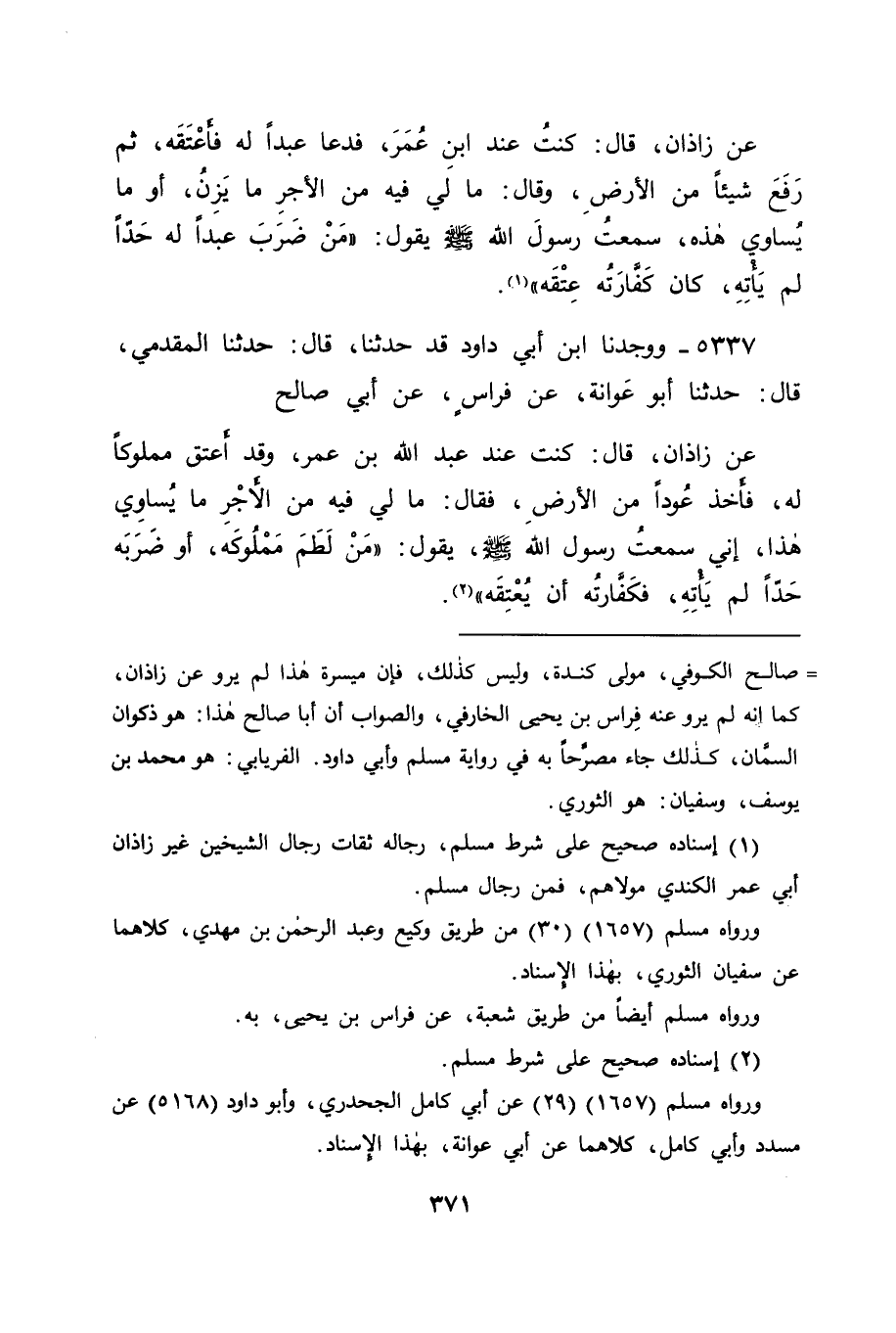 5337 - وَوَجَدْنَا ابْنَ أَبِي دَاوُدَ قَدْ حَدَّثَنَا قَالَ: حَدَّثَنَا الْمُقَدَّمِيُّ قَالَ: حَدَّثَنَا أَبُو عَوَانَةَ، عَنْ فِرَاسٍ، عَنْ أَبِي صَالِحٍ، عَنْ زَاذَانَ قَالَ: " كُنْتُ عِنْدَ عَبْدِ اللهِ بْنِ عُمَرَ وَقَدْ أَعْتَقَ مَمْلُوكًا لَهُ، فَأَخَذَ عُودًا مِنَ الْأَرْضِ، فَقَالَ: " مَا لِي فِيهِ مِنَ الْأَجْرِ مَا يُسَاوِي هَذَا، إِنِّي سَمِعْتُ رَسُولَ اللهِ صَلَّى اللَّهُ عَلَيْهِ وَسَلَّمَ يَقُولُ: " مَنْ لَطَمَ مَمْلُوكَهُ، أَوْ ضَرَبَهُ حَدًّا لَمْ يَأْتِهِ، فَكَفَّارَتُهُ أَنْ يُعْتِقَهُ " -[372]- قَالَ أَبُو جَعْفَرٍ: وَكَانَ ضَرْبُ الْحَدِّ مِنْ أَمْثَلِ الْمَثُلَاتِ، وَمِنَ النَّكَالِ الَّذِي جَعَلَهُ اللهُ عَزَّ وَجَلَّ مِنْ عُقُوبَاتِ الْمُذْنِبِينَ مَا يُوجِبُ مِثْلَهُ، وَلَمْ يَجْعَلْ مَنْ فَعَلَ ذَلِكَ بِعَبْدِهِ، قَدْ عَتَقَ عَلَيْهِ عَبْدُهُ لِقَوْلِهِ: " فَكَفَّارَتُهُ أَنْ يُعْتِقَهُ "، وَهُوَ قَبْلُ أَنْ يَعْتِقَهُ عَبْدٌ، وَفِيمَا قَدْ ذَكَرْنَا مَا قَدْ قَامَتْ بِهِ الْحُجَّةُ لِمَنْ يَنْفِي الْعَتَاقِ بِالْمُثْلَةِ الَّتِي وَصَفْنَا عَلَى مَنْ يُوجِبُهَا فِيمَا ذَكَرْنَا، وَاللهَ نَسْأَلُهُ التَّوْفِيقَ