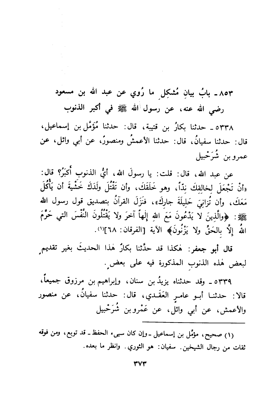 5338 - حَدَّثَنَا بَكَّارُ بْنُ قُتَيْبَةَ قَالَ: حَدَّثَنَا مُؤَمَّلُ بْنُ إِسْمَاعِيلَ قَالَ: حَدَّثَنَا سُفْيَانُ قَالَ: حَدَّثَنَا الْأَعْمَشُ، وَمَنْصُورٌ، عَنْ أَبِي وَائِلٍ، عَنْ عَمْرِو بْنِ شُرَحْبِيلَ، عَنْ عَبْدِ اللهِ قَالَ: قُلْتُ: يَا رَسُولَ اللهِ؛ أَيُّ الذُّنُوبِ أَكْبَرُ؟ قَالَ: " أَنْ تَجْعَلَ لِخَالِقِكَ نِدًّا وَهُوَ خَلَقَكَ، وَأَنْ تَقْتُلَ وَلَدَكَ خَشْيَةَ أَنْ يَأْكُلَ مَعَكَ، وَأَنْ تُزَانِيَ حَلِيلَةَ جَارِكَ "، فَنَزَلَ الْقُرْآنُ بِتَصْدِيقِ قَوْلِ رَسُولِ اللهِ صَلَّى اللَّهُ عَلَيْهِ وَسَلَّمَ: {وَالَّذِينَ لَا يَدْعُونَ مَعَ اللهِ إِلَهًا آخَرَ، وَلَا يَقْتُلُونَ النَّفْسَ الَّتِي حَرَّمَ اللهُ إِلَّا بِالْحَقِّ وَلَا يَزْنُونَ} [الفرقان: 68] " الْآيَةَ قَالَ أَبُو جَعْفَرٍ: هَكَذَا قَدْ حَدَّثَنَا بَكَّارٌ هَذَا الْحَدِيثَ بِغَيْرِ تَقْدِيمٍ لِبَعْضِ هَذِهِ الذُّنُوبِ الْمَذْكُورَةِ فِيهِ عَلَى بَعْضٍ