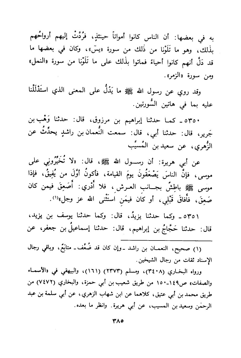 5350 - كَمَا حَدَّثَنَا إِبْرَاهِيمُ بْنُ مَرْزُوقٍ قَالَ: حَدَّثَنَا وَهْبُ بْنُ جَرِيرٍ قَالَ: حَدَّثَنَا أَبِي قَالَ: سَمِعْتُ النُّعْمَانَ بْنَ رَاشِدٍ يُحَدِّثُ، عَنِ الزُّهْرِيِّ، عَنْ سَعِيدِ بْنِ الْمُسَيِّبِ، عَنْ أَبِي هُرَيْرَةَ: أَنَّ رَسُولَ اللهِ صَلَّى اللَّهُ عَلَيْهِ وَسَلَّمَ قَالَ: " لَا تُخَيِّرُونِي عَلَى مُوسَى، فَإِنَّ النَّاسَ يُصْعَقُونَ يَوْمَ الْقِيَامَةِ، فَأَكُونُ أَوَّلَ مَنْ يُفِيقُ، فَإِذَا مُوسَى صَلَّى اللَّهُ عَلَيْهِ وَسَلَّمَ بَاطِشٌ بِجَانِبِ الْعَرْشِ، فَلَا أَدْرِي: أَصُعِقَ فِيمَنْ كَانَ صُعِقَ فَأَفَاقَ قَبْلِي، أَوْ كَانَ فِيمَنِ اسْتَثْنَى الله عَزَّ وَجَلَّ "