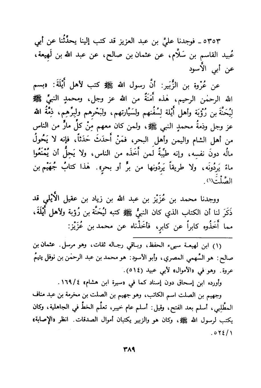 5353 - فَوَجَدْنَا عَلِيَّ بْنَ عَبْدِ الْعَزِيزِ قَدْ كَتَبَ إِلَيْنَا يُحَدِّثُنَا عَنْ أَبِي عُبَيْدٍ الْقَاسِمِ بْنِ سَلَّامٍ، عَنْ عُثْمَانَ بْنِ صَالِحٍ، عَنْ عَبْدِ اللهِ بْنِ لَهِيعَةَ، عَنْ أَبِي الْأَسْوَدِ، عَنْ عُرْوَةَ بْنِ الزُّبَيْرِ: " أَنَّ رَسُولَ اللهِ صَلَّى اللَّهُ عَلَيْهِ وَسَلَّمَ كَتَبَ لِأَهْلِ أَيْلَةَ: " بِسْمِ اللهِ الرَّحْمَنِ الرَّحِيمِ، هَذِهِ أَمَنَةٌ مِنَ اللهِ عَزَّ وَجَلَّ، وَمُحَمَّدٍ النَّبِيِّ صَلَّى اللَّهُ عَلَيْهِ وَسَلَّمَ لِيُحَنَّةَ بْنِ رُؤْبَةَ، وَأَهْلِ أَيْلَةَ لِسُفُنِهِمْ، وَلِسَيَّارَتِهِمْ، وَلِبَحْرِهِمْ، وَلِبَرِّهِمْ، ذِمَّةُ اللهِ عَزَّ وَجَلَّ، وَذِمَّةُ مُحَمَّدٍ النَّبِيِّ صَلَّى اللَّهُ عَلَيْهِ وَسَلَّمَ، وَلِمَنْ كَانَ مَعَهُمْ مِنْ كُلِّ مَارٍّ مِنَ النَّاسِ مَنِ أَهْلِ الشَّامِ، وَالْيَمَنِ، وَأَهْلِ الْبَحْرِ، فَمَنْ أَحْدَثَ حَدَثًا، فَإِنَّهُ لَا يَحُولُ مَالُهُ دُونَ نَفْسِهِ، وَإِنَّهُ طَيِّبَةٌ لِمَنْ أَخَذَهُ مِنَ النَّاسِ، وَلَا يَحِلُّ أَنْ يُمْنَعُوا مَاءً يَرِدُونَهُ، وَلَا طَرِيقًا يَرِدُونَهَا مِنْ بَرٍّ أَوْ بَحْرٍ " هَذَا كِتَابُ جُهَيْمِ بْنِ الصَّلْتِ وَوَجَدْنَا مُحَمَّدَ بْنَ عُزَيْزِ بْنِ عَبْدِ اللهِ بْنِ زِيَادِ بْنِ عَقِيلٍ الْأَيْلِيَّ قَدْ ذَكَرَ لَنَا أَنَّ الْكِتَابَ الَّذِي كَانَ النَّبِيُّ صَلَّى اللَّهُ عَلَيْهِ وَسَلَّمَ كَتَبَهُ لِيُحَنَّةَ بْنِ رُؤْبَةَ، وَلِأَهْلِ أَيْلَةَ مِمَّا أَخَذُوهُ كَابِرًا عَنْ كَابِرٍ، فَأَخَذْنَاهُ عَنْ مُحَمَّدِ بْنِ عُزَيْزٍ: " -[390]- بِسْمِ اللهِ الرَّحْمَنِ الرَّحِيمِ، هَذِهِ أَمَنَةٌ مِنَ اللهِ عَزَّ وَجَلَّ وَمُحَمَّدٍ النَّبِيِّ صَلَّى اللَّهُ عَلَيْهِ وَسَلَّمَ رَسُولِ اللهِ لِيُحَنَّةَ بْنِ رُؤْبَةَ، وَأَهْلِ أَيْلَةَ سُفُنِهِمْ، وَسَيَّارَتِهِمْ فِي الْبَحْرِ، وَالْبَرِّ، لَهُمْ ذِمَّةُ اللهِ عَزَّ وَجَلَّ، وَمُحَمَّدٍ النَّبِيِّ صَلَّى اللَّهُ عَلَيْهِ وَسَلَّمَ، وَلِمَنْ يَكُونُ مَعَهُمْ مِنْ كُلِّ مَارٍّ مِنْ أَهْلِ الْيَمَنِ، وَالْبَحْرِ، فَمَنْ أَحْدَثَ مِنْهُمْ فَإِنَّهُ لَا يَحُولُ مَالُهُ دُونَ نَفْسِهِ، وَإِنَّهُ طَيِّبَةٌ لِمَنْ أَخَذَهُ مِنَ النَّاسِ، وَإِنَّهُ لَا يَحِلُّ أَنْ يُمْنَعُوا مَاءً يَرِدُونَهُ، وَلَا طَرِيقًا يَرِدُونَهَا مِنْ بَحْرٍ أَوْ بَرٍّ " هَذَا كِتَابُ جُهَيْمِ بْنِ الصَّلْتِ، وَشُرَحْبِيلَ فَوَقَفَنَا بِمَا فِي هَاتَيْنِ الرِّوَايَتَيْنِ عَلَى كِتَابِ رَسُولِ اللهِ صَلَّى اللَّهُ عَلَيْهِ وَسَلَّمَ فِي ذَلِكَ الْمَعْنَى، كَيْفَ كَانَ؟ ثُمَّ نَظَرْنَا فِي الْمَعْنَى الَّذِي مِنْ أَجْلِهِ كَتَبَ لَهُمْ رَسُولُ اللهِ صَلَّى اللَّهُ عَلَيْهِ وَسَلَّمَ ذَلِكَ الْكِتَابَ، فَوَجَدْنَا الْقَادِمِينَ الَّذِينَ كَانُوا يَقْدُمُونَ عَلَيْهِمْ مِنَ الْيَمَنِ، وَمِنَ الشَّامِ كَانُوا عَلَى غَيْرِ دِينِ الْإِسْلَامِ مِنَ الشِّرْكِ، وَمِنَ النَّصْرَانِيَّةِ، وَمِنَ الْيَهُودِيَّةِ، وَكَانَ لِمَنْ وَافَاهُمْ مِنَ الْمُسْلِمِينَ فِي شَيْءٍ مِنْ تِلْكِ الْمَوَاضِعِ أَنْ يَغْنَمَهُمْ، كَمَا نَغْنَمُ مَنْ وَجَدْنَاهُ فِي بِلَادِنَا مِنْ أَهْلِ الْحَرْبِ، مِمَّنْ دَخَلَ إِلَيْنَا بِلَا أَمَانٍ، فَجَعَلَهُمْ رَسُولُ اللهِ صَلَّى اللَّهُ عَلَيْهِ وَسَلَّمَ بِمَا كَتَبَ لَهُمْ، مِمَّا ذَكَرْنَا بِخِلَافِ ذَلِكَ الْحُكْمِ، وَجَعَلَهُمْ إِذَا دَخَلُوا هَذِهِ الْمَوَاضِعَ آمِنَيْنَ عَلَى أَنْفُسِهِمْ، وَعَلَى مَا مَعَهُمْ مِنَ الْأَمْوَالِ، وَكَانَ فِي ذَلِكَ لِمَنْ كَتَبَ لَهُ ذَلِكَ الْكِتَابَ أَعْظَمُ الْمَنَافِعِ، لِأَنَّهُمْ يَمِيرُونَهُمْ، وَيَجْلِبُونَ إِلَيْهِمُ الْأَطْعِمَةَ الَّتِي يَعِيشُونَ