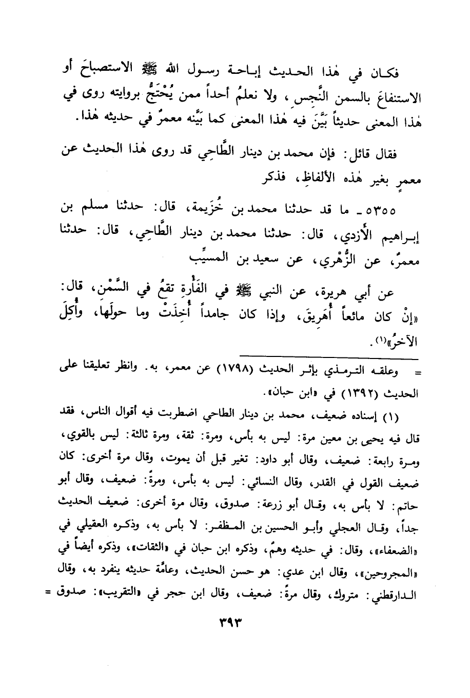 5355 - مَا قَدْ حَدَّثَنَا مُحَمَّدُ بْنُ خُزَيْمَةَ قَالَ: حَدَّثَنَا مُسْلِمُ بْنُ إِبْرَاهِيمَ الْأَزْدِيُّ قَالَ: حَدَّثَنَا مُحَمَّدُ بْنُ دِينَارٍ الطَّاحِيُّ قَالَ: حَدَّثَنَا مَعْمَرٌ، عَنِ الزُّهْرِيِّ، عَنْ سَعِيدِ بْنِ الْمُسَيِّبِ، عَنْ أَبِي هُرَيْرَةَ، عَنِ النَّبِيِّ صَلَّى اللَّهُ عَلَيْهِ وَسَلَّمَ فِي الْفَأْرَةِ تَقَعُ فِي السَّمْنِ قَالَ: " إِنْ كَانَ مَائِعًا أُهَرِيقَ، وَإِذَا كَانَ جَامِدًا أُخِذَتْ وَمَا حَوْلَهَا، وَأُكِلَ الْآخَرُ " -[394]- فَكَانَ جَوَابُنَا لَهُ فِي ذَلِكَ بِتَوْفِيقِ اللهِ عَزَّ وَجَلَّ وَعَوْنِهِ: أَنَّ كُلَّ وَاحِدٍ مِنْ عَبْدِ الْوَاحِدِ بْنِ زِيَادٍ، وَمِنْ مُحَمَّدِ بْنِ دِينَارٍ لَوْ تَفَرَّدَ بِحَدِيثٍ لَكَانَ مَقْبُولًا مِنْهُ، وَمَنْ كَانَ كَذَلِكَ، فَانْفَرَدَ بِزِيَادَةٍ فِي حَدِيثٍ، كَانَتْ تِلْكَ الزِّيَادَةُ مَقْبُولَةً مِنْهُ قَالَ: فَقَدْ رَوَى هَذَا الْحَدِيثَ عَنِ الزُّهْرِيِّ غَيْرُ مَعْمَرٍ، وَهُوَ ابْنُ عُيَيْنَةَ، وَمَالِكٌ، فَخَالَفَا مَعْمَرًا فِي إِسْنَادِهِ وَفِي مَتْنِهِ، فَذَكَرَ: