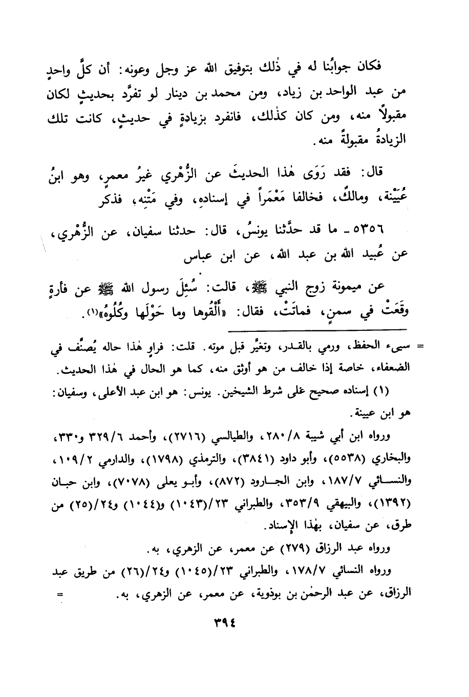 5356 - مَا قَدْ حَدَّثَنَا يُونُسُ قَالَ: حَدَّثَنَا سُفْيَانُ، عَنِ الزُّهْرِيِّ، عَنْ عُبَيْدِ اللهِ بْنِ عَبْدِ اللهِ، عَنِ ابْنِ عَبَّاسٍ، عَنْ مَيْمُونَةَ زَوْجِ النَّبِيِّ صَلَّى اللَّهُ عَلَيْهِ وَسَلَّمَ، قَالَتْ: " سُئِلَ رَسُولُ اللهِ صَلَّى اللَّهُ عَلَيْهِ وَسَلَّمَ عَنْ فَأْرَةٍ وَقَعَتْ فِي سَمْنٍ فَمَاتَتْ، فَقَالَ: " أَلْقُوهَا وَمَا حَوْلَهَا، وَكُلُوهُ " -[395]-