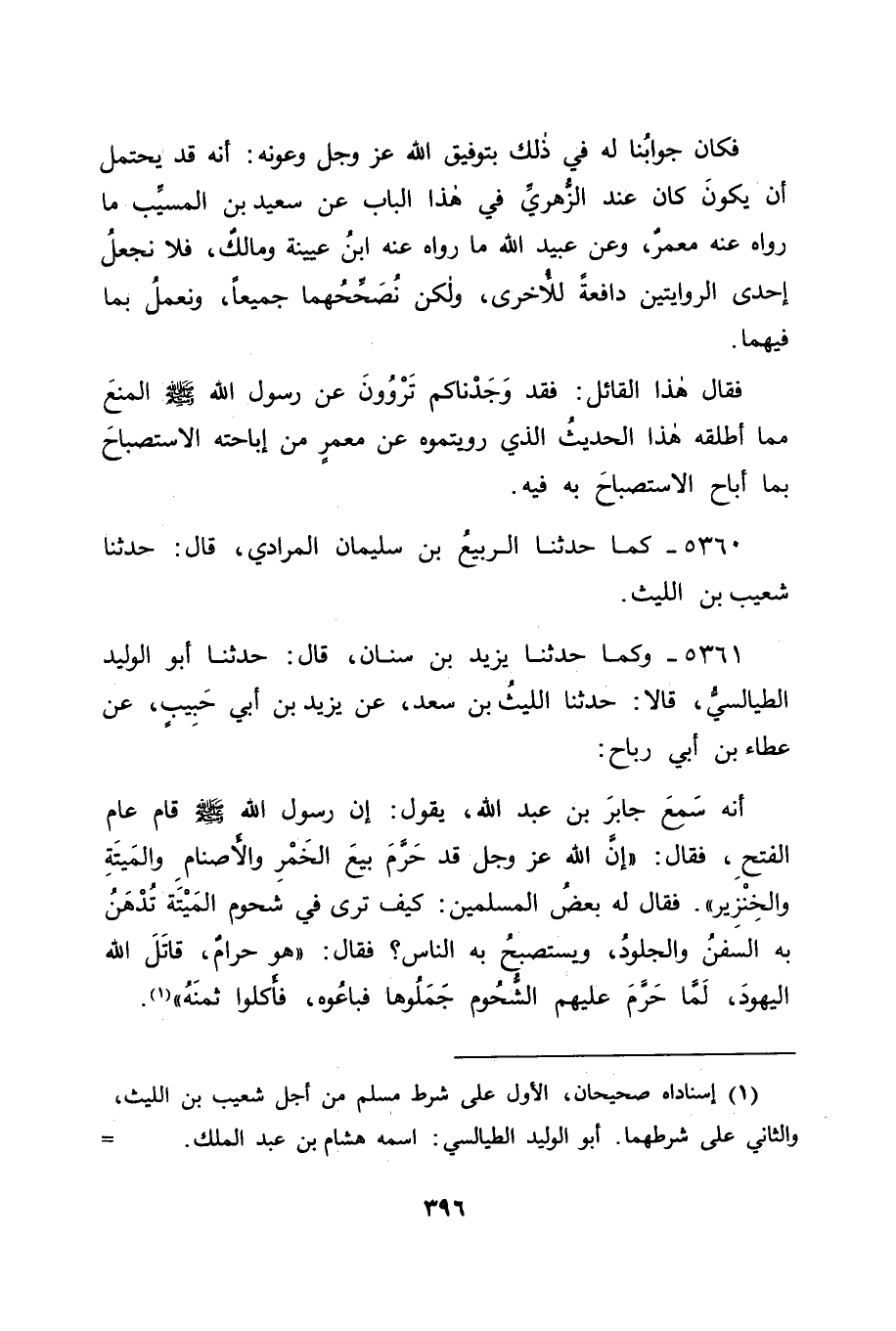 5361 - وَكَمَا حَدَّثَنَا يَزِيدُ بْنُ سِنَانٍ قَالَ: حَدَّثَنَا أَبُو الْوَلِيدِ الطَّيَالِسِيُّ قَالَا: حَدَّثَنَا اللَّيْثُ بْنُ سَعْدٍ، عَنْ يَزِيدَ بْنِ أَبِي حَبِيبٍ، عَنْ عَطَاءِ بْنِ أَبِي رَبَاحٍ: أَنَّهُ سَمِعَ جَابِرَ بْنَ عَبْدِ اللهِ يَقُولُ: " إِنَّ رَسُولَ اللهِ صَلَّى اللَّهُ عَلَيْهِ وَسَلَّمَ قَامَ عَامَ الْفَتْحِ، فَقَالَ: " إِنَّ اللهَ عَزَّ وَجَلَّ قَدْ حَرَّمَ بَيْعَ الْخَمْرِ، وَالْأَصْنَامَ، وَالْمَيْتَةَ، وَالْخِنْزِيرَ "، فَقَالَ لَهُ بَعْضُ الْمُسْلِمِينَ: كَيْفَ تَرَى فِي شُحُومِ الْمَيْتَةِ تُدْهَنُ بِهِ السُّفُنُ وَالْجُلُودُ، وَيَسْتَصْبِحُ بِهِ النَّاسُ؟، فَقَالَ: " هُوَ حَرَامٌ، قَاتَلَ اللهُ الْيَهُودَ، لَمَّا حَرَّمَ عَلَيْهِمُ الشُّحُومَ جَمَّلُوهَا، فَبَاعُوهُ، فَأَكَلُوا ثَمَنَهُ " -[397]- قَالَ: فَفِي هَذَا الْحَدِيثِ مَنْعُ رَسُولِ اللهِ صَلَّى اللَّهُ عَلَيْهِ وَسَلَّمَ مِنَ الِاسْتِصْبَاحِ بِشُحُومِ الْمَيْتَةِ، وَلَا فَرْقَ بَيْنَ شُحُومِ الْمَيْتَةِ، وَبَيْنَ السَّمْنِ الَّذِي قَدْ خَالَطَتْهُ الْمَيْتَةُ فَكَانَ جَوَابُنَا لَهُ فِي ذَلِكَ بِتَوْفِيقِ اللهِ عَزَّ وَجَلَّ وَعَوْنِهِ: أَنَّ الَّذِيَ فِي الْفَصْلِ الْأَوَّلِ مِنْ هَذَا الْبَابِ مِنْ حَدِيثِ مَعْمَرٍ، وَالَّذِي فِي هَذَا الْفَصْلِ الثَّانِي مِنْهُ مِنْ حَدِيثِ جَابِرٍ مُخْتَلِفَانِ؛ لِأَنَّ حَدِيثَ جَابِرٍ فِي شُحُومِ الْمَيْتَةِ الَّتِي هِيَ فِي نَفْسِهَا حَرَامٌ، وَشُحُومِهَا كَذَلِكَ، وَلَا يَحِلُّ الِانْتِفَاعُ بِالْحَرَامِ، وَالَّذِي فِي حَدِيثِ مَعْمَرٍ الَّذِي فِي الْفَصْلِ الْأَوَّلِ مِنْ هَذَا الْبَابِ، -[398]- إِنَّمَا هُوَ الِانْتِفَاعُ بِالسَّمْنِ النَّجِسِ، لِأَنَّ الْأَشْيَاءَ النَّجِسَةَ يَحِلُّ الِانْتِفَاعُ بِهَا مِنَ الثِّيَابِ النَّجِسَةِ الَّتِي لَا تَمْنَعُ نَجَاسَتُهَا مِنْ لِبْسِهَا، وَمِنَ النَّوْمِ فِيهَا، إِذَا كَانَتْ يَابِسَةً، لَا يُصِيبُ الْأَبْدَانَ مِنْهَا شَيْءٌ، فَكَذَلِكَ يَجُوزُ الِانْتِفَاعُ بِالسَّمْنِ النَّجِسِ، إِذْ كَانَ لَيْسَ بِمَيْتَةٍ فِي نَفْسِهِ، وَإِنْ كَانَ الَّذِي نَجَّسَهُ هُوَ الْمَيْتَةُ، حَتَّى يَصِحَّ الْحَدِيثَانِ اللَّذَانِ رُوِّينَاهُمَا عَنْ رَسُولِ اللهِ صَلَّى اللَّهُ عَلَيْهِ وَسَلَّمَ فِي هَذَيْنِ الْمَعْنَيَيْنِ، وَلَا يَتَضَادَّانِ وَقَدْ رُوِيَ هَذَا الْمَعْنَى فِي السَّمْنِ النَّجِسِ، عَنْ غَيْرِ وَاحِدٍ مِنْ أَصْحَابِ رَسُولِ اللهِ صَلَّى اللَّهُ عَلَيْهِ وَسَلَّمَ
