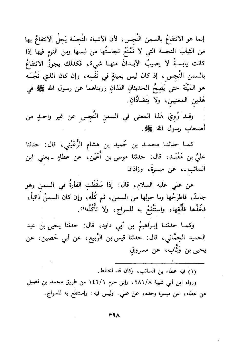 كَمَا حَدَّثَنَا مُحَمَّدُ بْنُ حُمَيْدِ بْنِ هِشَامٍ الرُّعَيْنِيُّ قَالَ: حَدَّثَنَا عَلِيُّ بْنُ مَعْبَدٍ قَالَ: حَدَّثَنَا مُوسَى بْنُ أَعْيُنَ، عَنْ عَطَاءٍ يَعْنِي: ابْنَ السَّائِبِ، عَنْ مَيْسَرَةَ، وَزَاذَانَ، عَنْ عَلِيٍّ عَلَيْهِ السَّلَامُ قَالَ: " إِذَا سَقَطَتِ الْفَأْرَةُ فِي السَّمْنِ وَهُوَ جَامِدٌ فَاطْرَحْهَا وَمَا حَوْلَهَا مِنَ السَّمْنِ، ثُمَّ كُلْهُ، وَإِنْ كَانَ السَّمْنُ ذَائِبًا فَخُذْهَا فَأَلْقِهَا، وَاسْتَنْفِعْ بِهِ لِلسِّرَاجِ، وَلَا تَأْكُلْهُ "