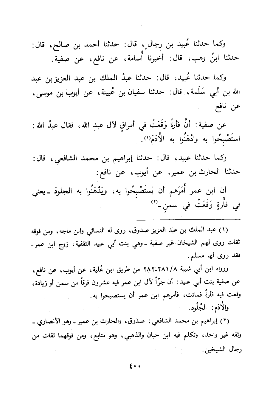 وَكَمَا حَدَّثَنَا عُبَيْدُ بْنُ رِجَالٍ قَالَ: حَدَّثَنَا أَحْمَدُ بْنُ صَالِحٍ قَالَ: حَدَّثَنَا ابْنُ وَهْبٍ قَالَ: أَخْبَرَنَا أُسَامَةُ، عَنْ نَافِعٍ، عَنْ صَفِيَّةَ وَكَمَا حَدَّثَنَا عُبَيْدٌ قَالَ: حَدَّثَنَا عَبْدُ الْمَلِكِ بْنُ عَبْدِ الْعَزِيزِ بْنِ عَبْدِ اللهِ بْنِ أَبِي سَلَمَةَ قَالَ: حَدَّثَنَا سُفْيَانُ بْنُ عُيَيْنَةَ، عَنْ أَيُّوبَ بْنِ مُوسَى، عَنْ نَافِعٍ، عَنْ صَفِيَّةَ: أَنَّ فَأْرَةً وَقَعَتْ فِي أَمْرَاقٍ لِآلِ عَبْدِ اللهِ، فَقَالَ عَبْدُ اللهِ " اسْتَصْبِحُوا بِهِ، وَادْهَنُوا بِهِ الْأَدَمَ "