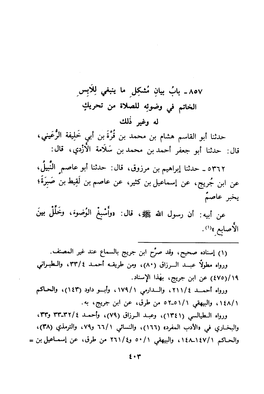 5363 - وَحَدَّثَنَا الرَّبِيعُ بْنُ سُلَيْمَانَ الْمُرَادِيُّ، حَدَّثَنَا أَسَدُ بْنُ مُوسَى، حَدَّثَنَا يَحْيَى بْنُ سُلَيْمٍ، عَنْ إِسْمَاعِيلَ بْنِ كَثِيرٍ، عَنْ عَاصِمِ بْنِ لَقِيطِ بْنِ صَبِرَةَ، عَنْ أَبِيهِ، عَنْ رَسُولِ اللهِ صَلَّى اللَّهُ عَلَيْهِ وَسَلَّمَ مِثْلَهُ قَالَ أَبُو جَعْفَرٍ: وَإِذَا كَانَ تَخْلِيلُ مَا بَيْنَ الْأَصَابِعِ فِي وُضُوءِ الصَّلَاةِ مَعَ سَعَةِ مَا بَيْنَهُمَا مِمَّا يُسْتَحَبُّ لِلْمُتَوَضِّئِ، أَنْ يَفْعَلَهُ، كَانَ لَابِسُ الْخَاتَمِ مَعَ ضِيقِ مَا بَيْنَهُ وَبَيْنَ الْأَصَابِعِ الَّتِي يُلْبِسُهَا إِيَّاهُ، بِمِثْلِ ذَلِكَ مِنْ تَحْرِيكِ خَاتَمِهِ فِي وُضُوئِهِ لِصَلَاتِهِ بِذَلِكَ أَوْلَى وَقَدْ رُوِيَ عَنْ عُمَرَ بْنِ الْخَطَّابِ رَضِيَ اللهُ عَنْهُ هَذَا الْمَذْهَبُ أَيْضًا