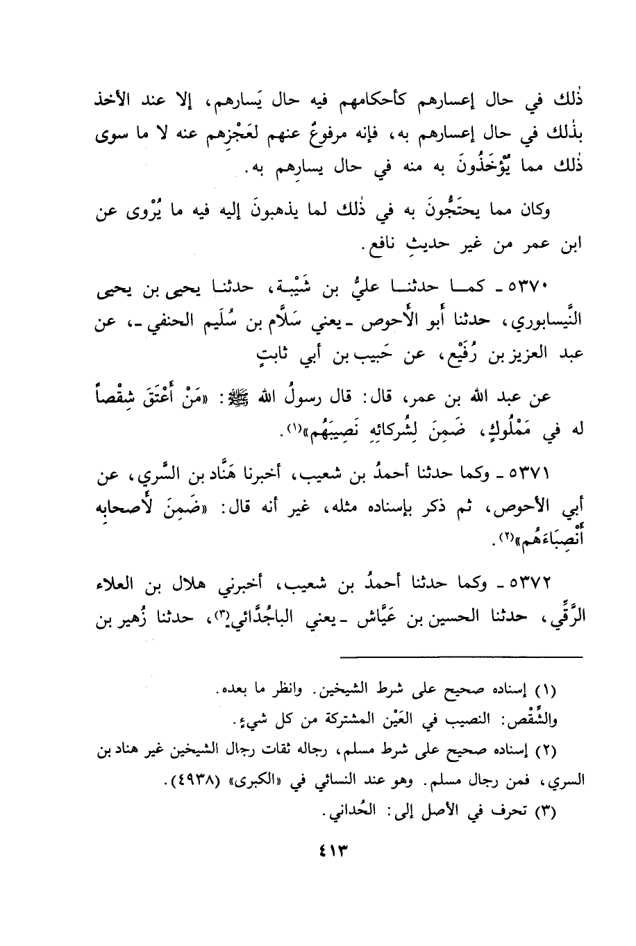 5372 - وَكَمَا حَدَّثَنَا أَحْمَدُ بْنُ شُعَيْبٍ، أَخْبَرَنِي هِلَالُ بْنُ الْعَلَاءِ الرَّقِّيُّ، حَدَّثَنَا الْحُسَيْنُ بْنُ عَيَّاشٍ يَعْنِي: الْبَاجُدَّائِيَّ، حَدَّثَنَا زُهَيْرُ بْنُ -[414]- مُعَاوِيَةَ، أَخْبَرَنَا عَبْدُ الْعَزِيزِ بْنُ رُفَيْعٍ، عَنْ عَمْرِو بْنِ دِينَارٍ، وَابْنِ أَبِي مُلَيْكَةَ، عَنِ ابْنِ عُمَرَ، قُلْتُ: عَنْ رَسُولِ اللهِ صَلَّى اللَّهُ عَلَيْهِ وَسَلَّمَ؟، قَالَ: نَعَمْ، قَالَ: " مَنْ أَعْتَقَ عَتَاقَةً فِيهَا شَرِيكٌ، فَتَمَامُ عِتْقِهِ عَلَى الَّذِي أَعْتَقَهُ " قَالَ أَبُو جَعْفَرٍ: فَاخْتَلَفَ أَبُو الْأَحْوَصِ، وَزُهَيْرُ بْنُ مُعَاوِيَةَ عَلَى عَبْدِ الْعَزِيزِ بْنِ رُفَيْعٍ فِي إِسْنَادِ هَذَا الْحَدِيثِ، وَرَوَاهُ كُلُّ وَاحِدٍ مِنْهُمَا عَنْهُ، كَمَا ذَكَرْنَاهُ عَنْهُ، وَاللهُ أَعْلَمُ بِحَقِيقَةِ الصَّوَابِ فِي ذَلِكَ وَكَانَ مِنَ الْحُجَّةِ عَلَى أَهْلِ هَذَا الْقَوْلِ لِمُخَالَفَتِهِمْ فِيهِ: أَنَّهُ قَدْ يَحْتَمِلُ أَنْ يَكُونَ الَّذِي فِي هَذَا الْحَدِيثِ مِمَّا حِفْظَهُ رَاوِيهِ عَنِ ابْنِ عُمَرَ عَنْ رَسُولِ اللهِ صَلَّى اللَّهُ عَلَيْهِ وَسَلَّمَ، مِمَّا حِفْظِهِ عَنْهُ فِيهِ عَلَى حُكْمِهِ إِذَا كَانَ مُوسِرًا، لَا عَلَى حُكْمِهِ إِذَا كَانَ مُعْسِرًا، وَكَانَ فِي حَدِيثِ عُبَيْدِ اللهِ بْنِ عُمَرَ عَنْ نَافِعٍ الَّذِي ذَكَرْنَاهُ فِي هَذَا الْبَابِ ذِكْرُ ذَلِكَ الْحُكْمِ فِي الْعِتَاقِ أَيْضًا، وَذِكْرُ الْوَاجِبِ بَعْدَهُ فِي يَسَارِ الْمُعْتِقِ، فَكَانَ الْأَوْلَى فِي ذَلِكَ أَنْ يُصَحَّحَ الْحَدِيثَانِ جَمِيعًا، وَيُجْعَلَانِ عَلَى أَنَّ الْمُرَادَ بِمَا فِيهِمَا مَا يَجِبُ عَلَى الْمُعْتِقِ فِي حَالِ يَسَارِهِ، لَا مَا سِوَاهُ ثُمَّ نَظَرْنَا فِي حَدِيثِ عُبَيْدِ اللهِ بْنِ عُمَرَ، عَنْ نَافِعٍ، مِنْ غَيْرِ حَدِيثِ يَحْيَى، وَخَالِدٍ عَنْهُ، كَيْفَ هُوَ؟