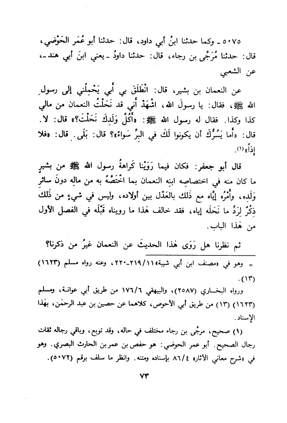 5075 - وَكَمَا حَدَّثَنَا ابْنُ أَبِي دَاوُدَ، قَالَ: حَدَّثَنَا أَبُو عُمَرَ الْحَوْضِيُّ، قَالَ: حَدَّثَنَا مُرَجَّى بْنُ رَجَاءٍ، قَالَ: حَدَّثَنَا دَاوُدُ يَعْنِي ابْنَ أَبِي هِنْدَ، عَنِ الشَّعْبِيِّ، عَنِ النُّعْمَانِ بْنِ بَشِيرٍ، قَالَ: انْطَلَقَ بِي أَبِي يَحْمِلُنِي إِلَى رَسُولِ اللهِ صَلَّى اللَّهُ عَلَيْهِ وَسَلَّمَ، فَقَالَ: يَا رَسُولَ اللهِ، اشْهَدْ أَنِّي قَدْ نَحَلْتُ النُّعْمَانَ مِنْ مَالِي كَذَا، وَكَذَا، فَقَالَ لَهُ رَسُولُ اللهِ صَلَّى اللَّهُ عَلَيْهِ وَسَلَّمَ: " أَكُلَّ وَلَدِكَ نَحَلْتَ؟ " قَالَ: لَا، قَالَ: " أَمَا يَسُرُّكَ أَنْ يَكُونُوا لَكَ فِي الْبِرِّ سَوَاءً؟ " قَالَ: بَلَى، قَالَ: " فَلَا إِذًا " قَالَ أَبُو جَعْفَرٍ: فَكَانَ فِيمَا رُوِّينَا كَرَاهَةُ رَسُولِ اللهِ صَلَّى اللَّهُ عَلَيْهِ وَسَلَّمَ مِنْ بَشِيرٍ مَا كَانَ عَنْهُ فِي اخْتِصَاصِهِ ابْنَهُ النُّعْمَانَ بِمَا اخْتَصَّهُ بِهِ مِنْ مَالِهِ دُونَ سَائِرِ وَلَدِهِ، وَأَمْرُهُ إِيَّاهُ مَعَ ذَلِكَ بِالْعَدْلِ بَيْنَ أَوْلَادِهِ، وَلَيْسَ فِي شَيْءٍ مِنْ ذَلِكَ ذِكْرٌ لَرَدِّ مَا نَحْلُهُ إِيَّاهُ، فَقَدْ خَالَفَ هَذَا مَا رُوِّينَاهُ قَبْلَهُ فِي الْفَصْلِ الْأَوَّلِ مِنْ هَذَا الْبَابِ ثُمَّ نَظَرْنَا هَلْ رَوَى هَذَا الْحَدِيثَ عَنِ النُّعْمَانِ غَيْرُ مَنْ ذَكَرْنَا؟