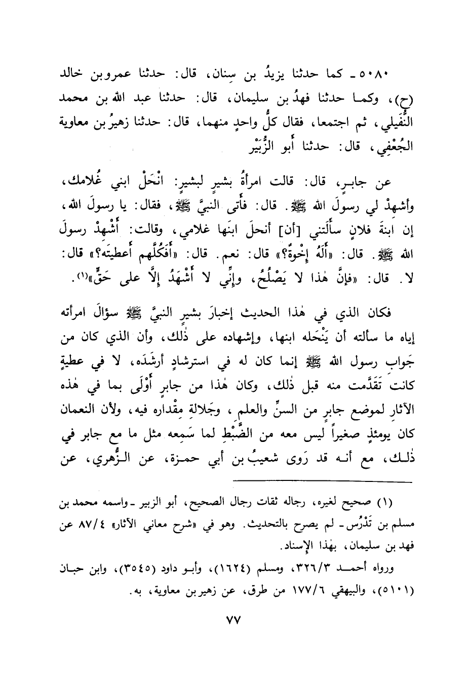 5080 - كَمَا حَدَّثَنَا يَزِيدُ بْنُ سِنَانٍ، قَالَ: حَدَّثَنَا عَمْرُو بْنُ خَالِدٍ، ح وَكَمَا حَدَّثَنَا فَهْدُ بْنُ سُلَيْمَانَ، قَالَ: حَدَّثَنَا عَبْدُ اللهِ بْنُ مُحَمَّدٍ النُّفَيْلِيُّ، ثُمَّ اجْتَمَعَا، فَقَالَ كُلُّ وَاحِدٍ مِنْهُمَا قَالَ: حَدَّثَنَا زُهَيْرُ بْنُ مُعَاوِيَةَ الْجُعْفِيُّ قَالَ: حَدَّثَنَا أَبُو الزُّبَيْرِ، عَنْ جَابِرٍ قَالَ: قَالَتِ امْرَأَةُ بَشِيرٍ لِبَشِيرٍ: " انْحَلِ ابْنِي غُلَامَكَ، وَأَشْهِدْ لِي رَسُولَ اللهِ صَلَّى اللَّهُ عَلَيْهِ وَسَلَّمَ " قَالَ: فَأَتَى النَّبِيَّ صَلَّى اللَّهُ عَلَيْهِ وَسَلَّمَ، فَقَالَ: يَا رَسُولَ اللهِ؛ إِنَّ ابْنَةَ فُلَانٍ سَأَلْتَنِي أَنْ أَنْحَلَ ابْنَهَا غُلَامِي، وَقَالَتْ: أَشْهِدْ رَسُولَ اللهِ صَلَّى اللَّهُ عَلَيْهِ وَسَلَّمَ قَالَ: " أَلَهُ إِخْوَةٌ؟ " قَالَ: نَعَمْ، قَالَ: " أَفَكُلَّهُمْ أَعْطَيْتَهُ؟ " قَالَ: لَا، قَالَ: " فَإِنَّ هَذَا لَا يَصْلُحُ، وَإِنِّي لَا أَشْهَدُ إِلَّا عَلَى حَقٍّ " فَكَانَ الَّذِي فِي هَذَا الْحَدِيثِ إِخْبَارَ بَشِيرٍ النَّبِيَّ صَلَّى اللَّهُ عَلَيْهِ وَسَلَّمَ سُؤَالَ امْرَأَتِهِ إِيَّاهُ مَا سَأَلْتُهُ أَنْ يَنْحَلَهُ ابْنَهَا، وَإِشْهَادَهُ عَلَى ذَلِكَ، وَأَنَّ الَّذِي كَانَ مِنْ جَوَابِ رَسُولِ اللهِ صَلَّى اللَّهُ عَلَيْهِ وَسَلَّمَ، إِنَّمَا كَانَ لَهُ فِي اسْتِرْشَادٍ أَرْشَدَهُ، لَا فِي عَطِيَّةٍ كَانَتْ تَقَدَّمَتْ مِنْهُ قَبْلَ ذَلِكَ، وَكَانَ هَذَا مِنْ جَابِرٍ أَوْلَى بِمَا فِي هَذِهِ الْآثَارِ لِمَوْضِعِ جَابِرٍ مِنَ السِّنِّ وَالْعِلْمِ، وَجَلَالَةِ مِقْدَارِهِ فِيهِ، وَلَأَنَّ النُّعْمَانَ كَانَ يَوْمَئِذٍ صَغِيرًا لَيْسَ مَعَهُ مِنَ الضَّبْطِ لِمَا سَمِعَهُ مِثْلَ مَا مَعَ جَابِرٍ فِي ذَلِكَ، مَعَ أَنَّهُ قَدْ رَوَى شُعَيْبُ بْنُ أَبِي حَمْزَةَ، عَنِ الزُّهْرِيِّ، عَنْ -[78]- حُمَيْدِ بْنِ عَبْدِ الرَّحْمَنِ، وَمُحَمَّدِ بْنِ النُّعْمَانِ، عَنِ النُّعْمَانِ هَذَا الْحَدِيثَ بِمَعْنًى يَدُلُّ عَلَى مَا رَوَاهُ عَلَيْهِ جَابِرٌ