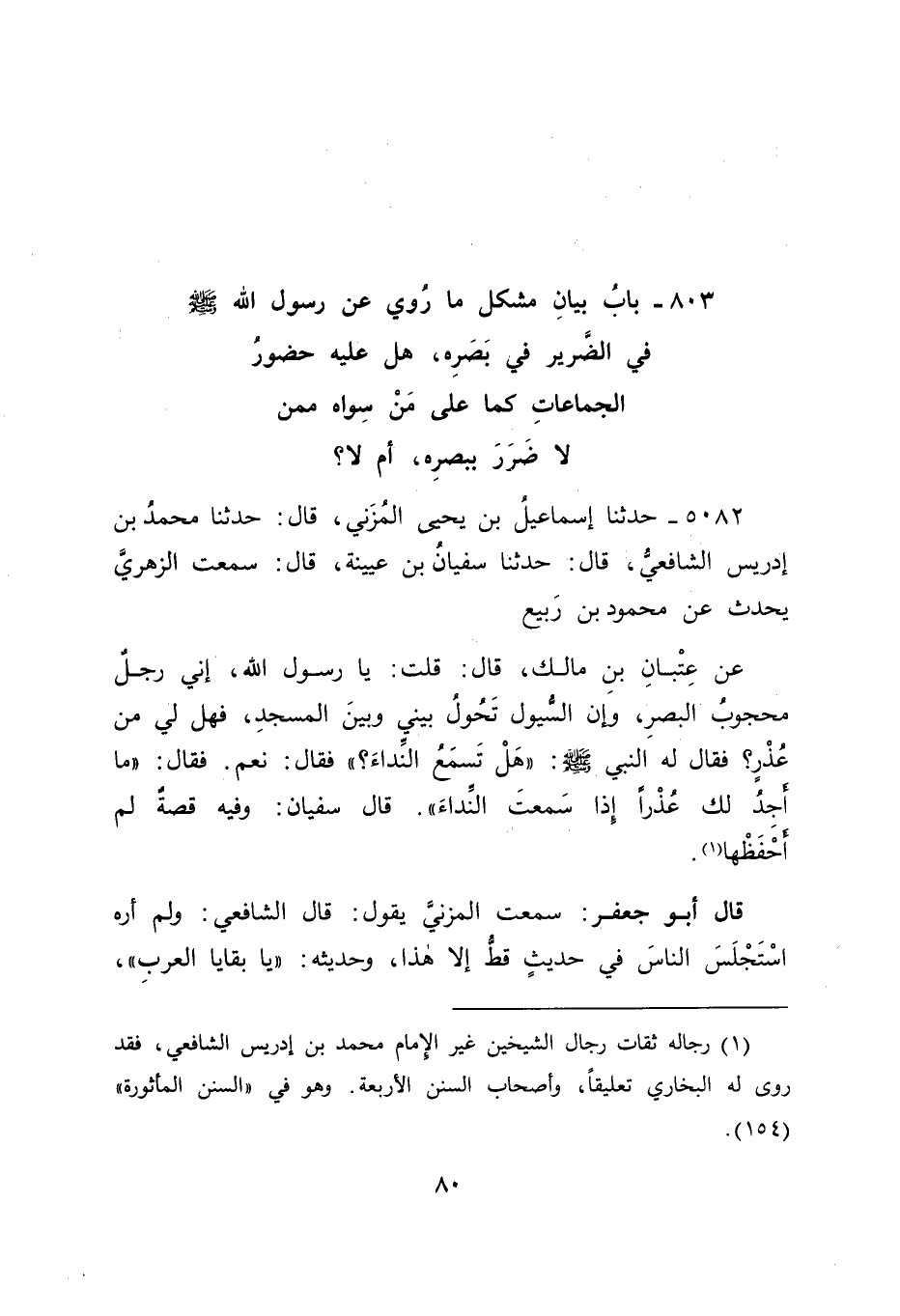5082 - حَدَّثَنَا إِسْمَاعِيلُ بْنُ يَحْيَى الْمُزَنِيُّ، قَالَ: حَدَّثَنَا مُحَمَّدُ بْنُ إِدْرِيسَ الشَّافِعِيُّ، قَالَ: حَدَّثَنَا سُفْيَانُ بْنُ عُيَيْنَةَ، قَالَ: سَمِعْتُ الزُّهْرِيَّ، يُحَدِّثُ عَنْ مَحْمُودِ بْنِ رَبِيعٍ، عَنْ عِتْبَانَ بْنِ مَالِكٍ، قَالَ: قُلْتُ: " يَا رَسُولَ اللهِ، إِنِّي رَجُلٌ مَحْجُوبُ الْبَصَرِ، وَإِنَّ السُّيُولَ تَحَولُ بَيْنِي وَبَيْنَ الْمَسْجِدِ، فَهَلْ لِي مِنْ عُذْرٍ؟، فَقَالَ لَهُ النَّبِيِّ صَلَّى اللَّهُ عَلَيْهِ وَسَلَّمَ: " هَلْ تَسْمَعُ النِّدَاءَ؟ "، فَقَالَ: نَعَمْ، فَقَالَ: " مَا أَجِدُ لَكَ عُذْرًا إِذَا سَمِعْتَ النِّدَاءَ " قَالَ سُفْيَانُ: وَفِيهِ قِصَّةٌ لَمْ أَحْفَظْهَا قَالَ أَبُو جَعْفَرٍ: سَمِعْتُ الْمُزَنِيَّ يَقُولُ: قَالَ الشَّافِعِيُّ: وَلَمْ أَرَهُ اسْتَجْلَسَ النَّاسَ فِي حَدِيثٍ قَطُّ، إِلَّا هَذَا وَحَدِيثَهُ: " يَا بَقَايَا الْعَرَبِ "، -[81]- وَكَانَ سُفْيَانُ يَتَوَقَّاهُ، وَيَعْرِفْ أَنَّهُ لَا يَضْبِطُهُ