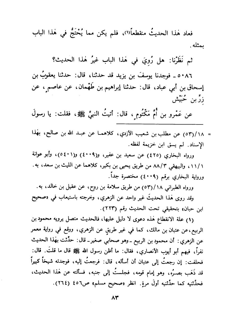 5086 - فَوَجَدْنَا يُوسُفَ بْنَ يَزِيدَ قَدْ حَدَّثَنَا قَالَ: حَدَّثَنَا يَعْقُوبُ بْنُ إِسْحَاقَ بْنِ أَبِي عَبَّادٍ قَالَ: حَدَّثَنَا إِبْرَاهِيمُ بْنُ طَهْمَانَ، عَنْ عَاصِمٍ، عَنْ زِرِّ بْنِ حُبَيْشٍ، عَنْ عَمْرِو بْنِ أُمِّ مَكْتُومٍ قَالَ: أَتَيْتُ النَّبِيَّ صَلَّى اللَّهُ عَلَيْهِ وَسَلَّمَ، فَقُلْتُ: يَا رَسُولَ -[84]- اللهِ، إِنِّي شَيْخٌ ضَرِيرُ الْبَصَرِ، شَاسِعُ الدَّارِ، وَلِي قَائِدٌ لَا يُلَائِمُنِي، وَبَيْنِي وَبَيْنَ الْمَسْجِدِ شَجَرٌ وَأَنْهَارٌ، فَهَلْ لِي مِنْ عُذْرٍ أَنْ أُصَلِّيَ فِي بَيْتِي؟، فَقَالَ: " هَلْ تَسْمَعُ النِّدَاءَ؟ "، قُلْتُ: نَعَمْ، قَالَ: " فَأْتِهَا " قَالَ أَبُو جَعْفَرٍ: فَكَانَ هَذَا الْحَدِيثُ مِنْ أَحْسَنِ مَا وَجَدْنَاهُ فِي هَذَا الْبَابِ، لِأَنَّ زِرَّ بْنَ حُبَيْشٍ قَدْ سَمِعَ مِنَ عُمَرَ بْنِ الْخَطَّابِ، وَمَنْ أُبَيِّ بْنِ كَعْبٍ، فَلَيْسَ بِمُسْتَنْكَرٍ مِنْهُ سَمَاعُ هَذَا الْحَدِيثِ مِنَ ابْنِ أُمِّ مَكْتُومٍ، لِأَنَّهُ قَدْ بَقِيَ بَعْدَ النَّبِيِّ صَلَّى اللَّهُ عَلَيْهِ وَسَلَّمَ، وَحَضَرَ فَتْحَ الْقَادِسِيَّةِ، وَكَانَ حَامِلَ الرَّايَةِ يَوْمَئِذٍ لِأَهْلِهَا -[85]- وَوَجَدْنَا فِي هَذَا الْبَابِ أَيْضًا