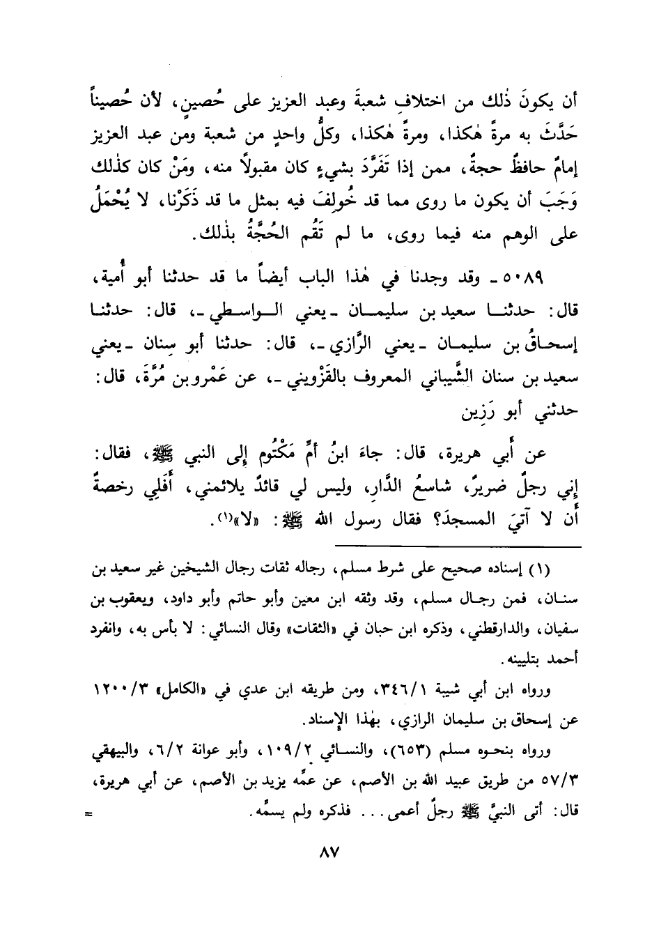 5089 - وَقَدْ وَجَدْنَا فِي هَذَا الْبَابِ أَيْضًا مَا قَدْ حَدَّثَنَا أَبُو أُمَيَّةَ قَالَ: حَدَّثَنَا سَعِيدُ بْنُ سُلَيْمَانَ يَعْنِي الْوَاسِطِيَّ قَالَ: حَدَّثَنَا إِسْحَاقُ بْنُ سُلَيْمَانَ يَعْنِي الرَّازِيَّ قَالَ: حَدَّثَنَا أَبُو سِنَانٍ يَعْنِي سَعِيدَ بْنَ سِنَانٍ الشَّيْبَانِيَّ الْمَعْرُوفَ بِالْقَزْوِينِيِّ، عَنْ عَمْرِو بْنِ مُرَّةَ قَالَ: حَدَّثَنِي أَبُو رَزِينٍ، عَنْ أَبِي هُرَيْرَةَ قَالَ: " جَاءَ ابْنُ أُمِّ مَكْتُومٍ إِلَى النَّبِيِّ صَلَّى اللَّهُ عَلَيْهِ وَسَلَّمَ، فَقَالَ: إِنِّي رَجُلٌ ضَرِيرٌ، شَاسِعُ الدَّارِ، وَلَيْسَ لِي قَائِدٌ يُلَائِمُنِي، أَفَلِي رُخْصَةٌ، أَنْ لَا آتِيَ الْمَسْجِدَ؟، فَقَالَ رَسُولُ اللهِ صَلَّى اللَّهُ عَلَيْهِ وَسَلَّمَ: " لَا " -[88]- فَطَعَنَ طَاعِنٌ فِي إِسْنَادِ هَذَا الْحَدِيثِ أَيْضًا بِأَنْ قَالَ: قَدْ رَوَاهُ شُعْبَةُ، عَنْ عَمْرِو بْنِ مُرَّةَ، عَنِ ابْنِ أَبِي لَيْلَى، وَلَمْ يَتَجَاوَزْهُ بِهِ