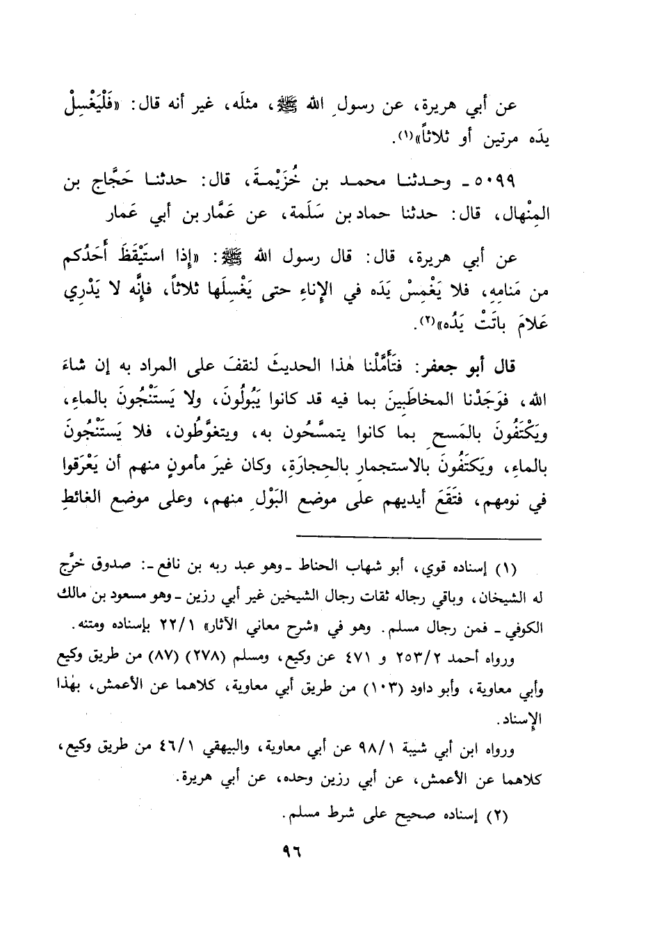 5099 - وَحَدَّثَنَا مُحَمَّدُ بْنُ خُزَيْمَةَ قَالَ: حَدَّثَنَا حَجَّاجُ بْنُ الْمِنْهَالِ قَالَ: حَدَّثَنَا حَمَّادُ بْنُ سَلَمَةَ، عَنْ عَمَّارِ بْنِ أَبِي عَمَّارٍ، عَنْ أَبِي هُرَيْرَةَ قَالَ: قَالَ رَسُولُ اللهِ صَلَّى اللَّهُ عَلَيْهِ وَسَلَّمَ: " إِذَا اسْتَيْقَظَ أَحَدُكُمْ مِنْ مَنَامِهِ، فَلَا يَغْمِسْ يَدَهُ فِي الْإِنَاءِ، حَتَّى يَغْسِلَهَا ثَلَاثًا، فَإِنَّهُ لَا يَدْرِي عَلَامَ بَاتَتْ يَدُهُ " قَالَ أَبُو جَعْفَرٍ: فَتَأَمَّلْنَا هَذَا الْحَدِيثَ لِنَقِفَ عَلَى الْمُرَادِ بِهِ إِنْ شَاءَ اللهُ، فَوَجَدْنَا الْمُخَاطَبِينَ بِمَا فِيهِ قَدْ كَانُوا يَبُولُونَ، وَلَا يَسْتَنْجُونَ بِالْمَاءِ، وَيَكْتَفُونَ بِالْمَسْحِ بِمَا كَانُوا يَتَمَسَّحُونَ بِهِ، وَيَتَغَوَّطُونَ، فَلَا يَسْتَنْجُونَ بِالْمَاءِ، وَيَكْتَفُونَ بِالِاسْتِجْمَارِ بِالْحِجَارَةِ، وَكَانَ غَيْرُ مَأْمُونٍ مِنْهُمْ أَنْ يَعْرَقُوا فِي نَوْمِهِمْ، فَتَقَعَ أَيْدِيهِمْ عَلَى مَوْضِعِ الْبَوْلِ مِنْهُمْ، وَعَلَى مَوْضِعِ الْغَائِطِ -[97]- مِنْهُمْ، فَتَنْجُسُ أَيْدِيهِمْ بِذَلِكَ، فَأُمِرُوا بِغَسْلِهَا قَبْلَ أَنْ يُدْخِلُوهَا الْآنِيَةَ الَّتِي فِيهَا الْمَاءُ الَّذِي يُحَاوِلُونَ التَّطْهِيرَ بِهِ لِصَلَوَاتِهِمْ، لِيُدْخِلُوهَا فِيهَا عَلَى عِلْمٍ مِنْهُمْ بِطَهَارَتِهَا، وَإِنْ كَانَتْ فِي الْعِبَادَةِ الَّتِي تُعُبِّدُوا بِهَا عَلَى الطَّهَارَةِ الَّتِي قَدْ يَتَيَقَّنُونَهَا، حَتَّى يَعْلَمُوا يَقِينًا بِخُرُوجِهَا مِنْ ذَلِكَ إِلَى ضِدِّهِ، فَمِنْ ذَلِكَ مَا قَدْ رُوِيَ عَنِ النَّبِيِّ صَلَّى اللَّهُ عَلَيْهِ وَسَلَّمَ فِي الَّذِي يُخَيَّلُ إِلَيْهِ وَهُوَ فِي الصَّلَاةِ أَنَّهُ يَجِدُ شَيْئًا مِنْ قَوْلِهِ لَهُ: " لَا تَنْصَرِفْ، حَتَّى تَجِدَ رِيحًا، أَوْ تَسْمَعَ صَوْتًا "