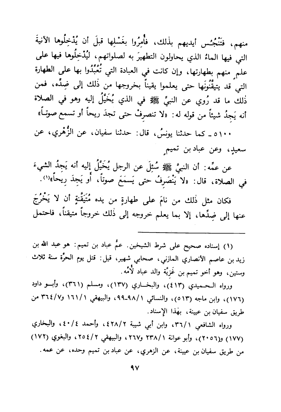 5100 - كَمَا حَدَّثَنَا يُونُسُ قَالَ: حَدَّثَنَا سُفْيَانُ، عَنِ الزُّهْرِيِّ، عَنْ سَعِيدٍ، وَعَنْ عُبَادَةَ بْنِ تَمِيمٍ، عَنْ عَمِّهِ: أَنَّ النَّبِيَّ صَلَّى اللَّهُ عَلَيْهِ وَسَلَّمَ سُئِلَ عَنِ الرَّجُلِ يُخَيَّلُ إِلَيْهِ أَنَّهُ يَجِدُ الشَّيْءَ فِي الصَّلَاةِ قَالَ: " لَا يَنْصَرِفْ، حَتَّى يَسْمَعَ صَوْتًا، أَوْ يَجِدَ رِيحًا " فَكَانَ مِثْلُ ذَلِكَ مَنْ نَامَ عَلَى طَهَارَةٍ مِنْ يَدِهِ مُتَيَقَّنَةٍ أَنْ لَا يَخْرُجَ عَنْهَا إِلَى ضِدِّهَا، إِلَّا بِمَا يَعْلَمُ خُرُوجَهُ إِلَى ذَلِكَ خُرُوجًا مُتَيَقِّنًا، فَاحْتُمِلَ -[98]- أَنْ يَكُونَ الَّذِي أَمَرَ بِهِ صَلَّى اللَّهُ عَلَيْهِ وَسَلَّمَ فِي هَذِهِ الْآثَارِ عَلَى الِاخْتِيَارِ، لَا عَلَى الْوُجُوبِ فَقَالَ قَائِلٌ: فَقَدْ عُورِضَ أَبُو هُرَيْرَةَ فِي ذَلِكَ بِمَا اسْتَعَاذَ مِنْ شَرِّ مُعَارِضِهِ بِهِ، إِذَا لَمْ يَكُنْ فِيهِ مَعَهُ حَجَّةٌ، فَإِنَّهُ يَدْفَعُ مَا عَارَضَهُ بِهِ فِيهِ