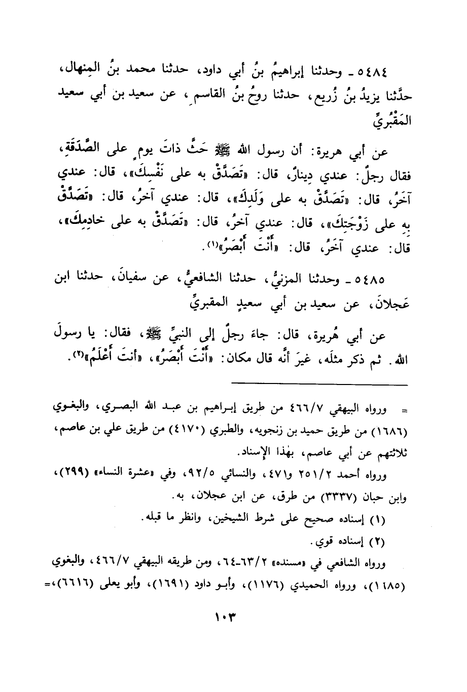 5484 - وَحَدَّثَنَا إِبْرَاهِيمُ بْنُ أَبِي دَاوُدَ، حَدَّثَنَا مُحَمَّدُ بْنُ الْمِنْهَالِ، حَدَّثَنَا يَزِيدُ بْنُ زُرَيْعٍ، حَدَّثَنَا رَوْحُ بْنُ الْقَاسِمِ، عَنْ سَعِيدِ بْنِ أَبِي سَعِيدٍ الْمَقْبُرِيِّ، عَنْ أَبِي هُرَيْرَةَ، أَنَّ رَسُولَ اللهِ صَلَّى اللَّهُ عَلَيْهِ وَسَلَّمَ حَثَّ ذَاتَ يَوْمٍ عَلَى الصَّدَقَةِ، فَقَالَ رَجُلٌ: عِنْدِي دِينَارٌ، قَالَ: " تَصَدَّقْ بِهِ عَلَى نَفْسِكَ " قَالَ: عِنْدِي آخَرُ، قَالَ: " تَصَدَّقْ بِهِ عَلَى وَلَدِكَ " قَالَ: عِنْدِي آخَرُ، قَالَ: " تَصَدَّقْ بِهِ عَلَى زَوْجَتِكَ " قَالَ: عِنْدِي آخَرُ قَالَ: " تَصَدَّقْ بِهِ عَلَى خَادِمِكَ " قَالَ: عِنْدِي آخَرُ قَالَ: " أَنْتَ أَبْصَرُ " ,