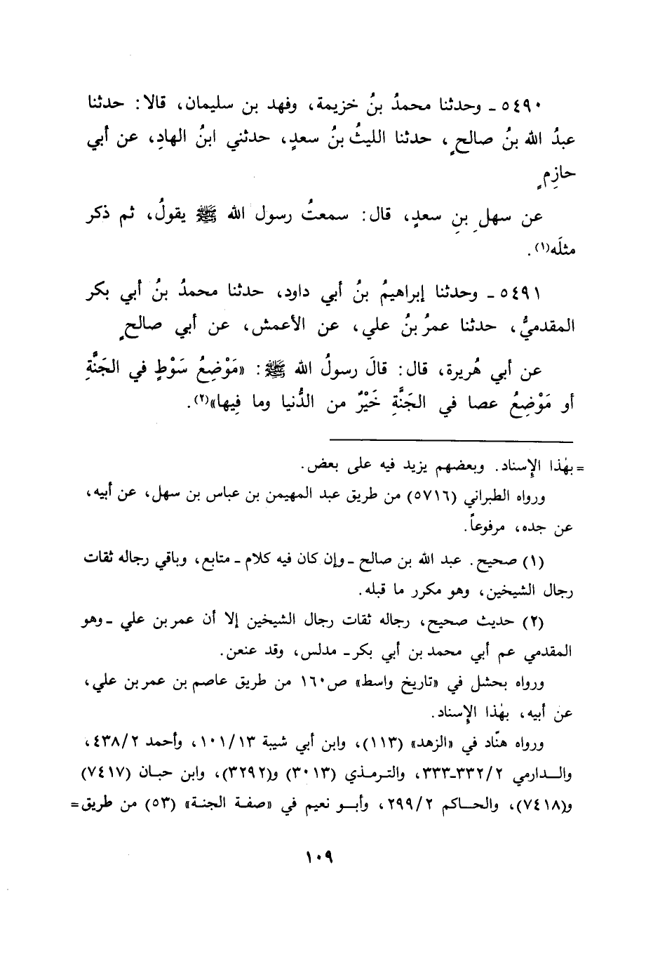 5491 - وَحَدَّثَنَا إِبْرَاهِيمُ بْنُ أَبِي دَاوُدَ، حَدَّثَنَا مُحَمَّدُ بْنُ أَبِي بَكْرٍ الْمُقَدَّمِيُّ، حَدَّثَنَا عُمَرُ بْنُ عَلِيٍّ، عَنِ الْأَعْمَشِ، عَنْ أَبِي صَالِحٍ، عَنْ أَبِي هُرَيْرَةَ قَالَ: قَالَ رَسُولُ اللهِ صَلَّى اللَّهُ عَلَيْهِ وَسَلَّمَ: " مَوْضِعُ سَوْطٍ فِي الْجَنَّةِ، أَوْ مَوْضِعُ عَصًا فِي الْجَنَّةِ، خَيْرٌ مِنَ الدُّنْيَا وَمَا فِيهَا " -[110]- فَقَالَ قَائِلٌ: فَمَا الْمُنْتَفَعُ بِمَوْضِعِ سَوْطٍ فِي الْجَنَّةِ؟ فَكَانَ جَوَابَنَا لَهُ فِي ذَلِكَ: أَنَّ الْمُرَادَ بِهِ - وَاللهُ أَعْلَمُ - إِنَّمَا هُوَ مَوْضِعُ سَوْطٍ فِي الْجَنَّةِ مِمَّا يُعْطِيهِ اللهُ عَزَّ وَجَلَّ مَنْ يُعْطِيهِ مِنْ عِبَادِهِ مِنْهَا مَا فِيهِ السَّعَةُ، فَمَوْضِعُ سَوْطٍ مِنْ ذَلِكَ خَيْرٌ مِنَ الدُّنْيَا وَمَا فِيهَا، وَمِثْلُ ذَلِكَ مِنْ كَلَامِ النَّاسِ الَّذِي يَجْرِي عَلَى أَلْسِنَتِهِمْ قَوْلُ أَحَدِهِمْ: شِبْرٌ مِنْ دَارِي أَحَبُّ إِلَيَّ مِنْ كَذَا وَكَذَا، لَيْسَ يَعْنِي بِذَلِكَ ذَلِكَ الْمِقْدَارَ عَلَى أَنْ لَا يَكُونَ لَهُ مِنْ تِلْكَ الدَّارِ سِوَاهُ , وَلَكِنْ يَعْنِي بِهِ ذَلِكَ الْمِقْدَارَ الَّذِي هُوَ مِنَ الدَّارِ الَّتِي هِيَ لَهُ، وَكَانَتْ عَطَايَا اللهِ عَزَّ وَجَلَّ لِأَهْلِ الْجَنَّةِ أَوْسَعَ مِنْ ذَلِكَ، بَلْ قَدْ رُوِيَ أَنَّ أَدْنَى أَهْلِ الْجَنَّةِ مَنْزِلَةً يُعْطَى مِثْلَ الدُّنْيَا، وَعَشَرَةَ أَمْثَالِهَا