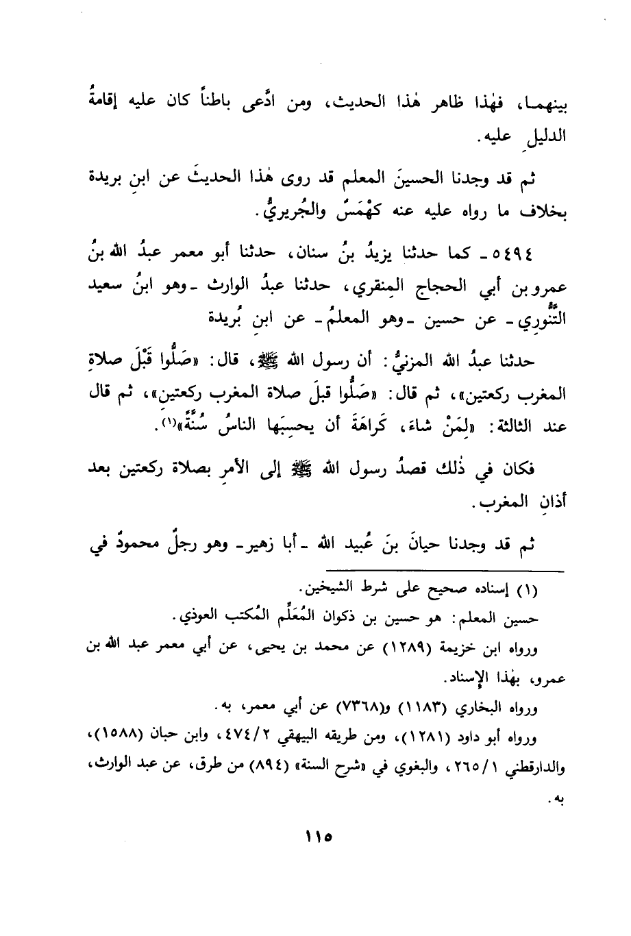 5494 - كَمَا حَدَّثَنَا يَزِيدُ بْنُ سِنَانٍ، حَدَّثَنَا أَبُو مَعْمَرٍ عَبْدُ اللهِ بْنُ عَمْرِو بْنِ أَبِي الْحَجَّاجِ الْمَنْقَرِيُّ، حَدَّثَنَا عَبْدُ الْوَارِثِ، وَهُوَ ابْنُ سَعِيدٍ التَّنُّورِيُّ , عَنْ حُسَيْنٍ، وَهُوَ الْمُعَلِّمُ , عَنِ ابْنِ بُرَيْدَةَ، حَدَّثَنَا عَبْدُ اللهِ الْمُزَنِيُّ أَنَّ رَسُولَ اللهِ صَلَّى اللَّهُ عَلَيْهِ وَسَلَّمَ قَالَ: " صَلُّوا قَبْلَ صَلَاةِ الْمَغْرِبِ رَكْعَتَيْنِ "، ثُمَّ قَالَ: " صَلُّوا قَبْلَ صَلَاةِ الْمَغْرِبِ رَكْعَتَيْنِ "، ثُمَّ قَالَ عِنْدَ الثَّالِثَةِ: " لِمَنْ شَاءَ "، كَرَاهَةَ أَنْ يَحْسِبَهَا النَّاسُ سُنَّةً " فَكَانَ فِي ذَلِكَ قَصْدُ رَسُولِ اللهِ صَلَّى اللَّهُ عَلَيْهِ وَسَلَّمَ إِلَى الْأَمْرِ بِصَلَاةِ رَكْعَتَيْنِ بَعْدَ أَذَانِ الْمَغْرِبِ، ثُمَّ قَدْ وَجَدْنَا حَيَّانَ بْنَ عُبَيْدِ اللهِ , أَبَا زُهَيْرٍ وَهُوَ رَجُلٌ مَحْمُودٌ فِي -[116]- رِوَايَتِهِ قَدْ رَوَى هَذَا الْحَدِيثَ عَنِ ابْنِ بُرَيْدَةَ، فَخَالَفَ كَهْمَسًا، وَالْجُرَيْرِيَّ، وَالْحُسَيْنَ الْمُعَلِّمَ فِيمَا رَوَوْهُ عَلَيْهِ عَنْهُ