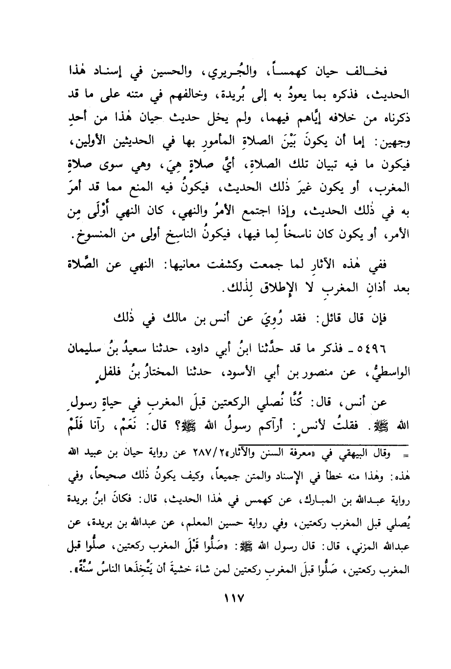 5496 - فَذَكَرَ مَا قَدْ حَدَّثَنَا ابْنُ أَبِي دَاوُدَ، حَدَّثَنَا سَعِيدُ بْنُ سُلَيْمَانَ الْوَاسِطِيُّ، عَنْ مَنْصُورِ بْنِ أَبِي الْأَسْوَدِ، حَدَّثَنَا الْمُخْتَارُ بْنُ فُلْفُلٍ، عَنْ أَنَسٍ قَالَ: " كُنَّا نُصَلِّي الرَّكْعَتَيْنِ قَبْلَ الْمَغْرِبِ فِي حَيَاةِ رَسُولِ اللهِ صَلَّى اللَّهُ عَلَيْهِ وَسَلَّمَ "، فَقُلْتُ لِأَنَسٍ: أَرَآكُمْ رَسُولُ اللهِ صَلَّى اللَّهُ عَلَيْهِ وَسَلَّمَ؟ قَالَ: " نَعَمْ، رَآنَا فَلَمْ -[118]- يَأْمُرْنَا، وَلَمْ يَنْهَنَا "