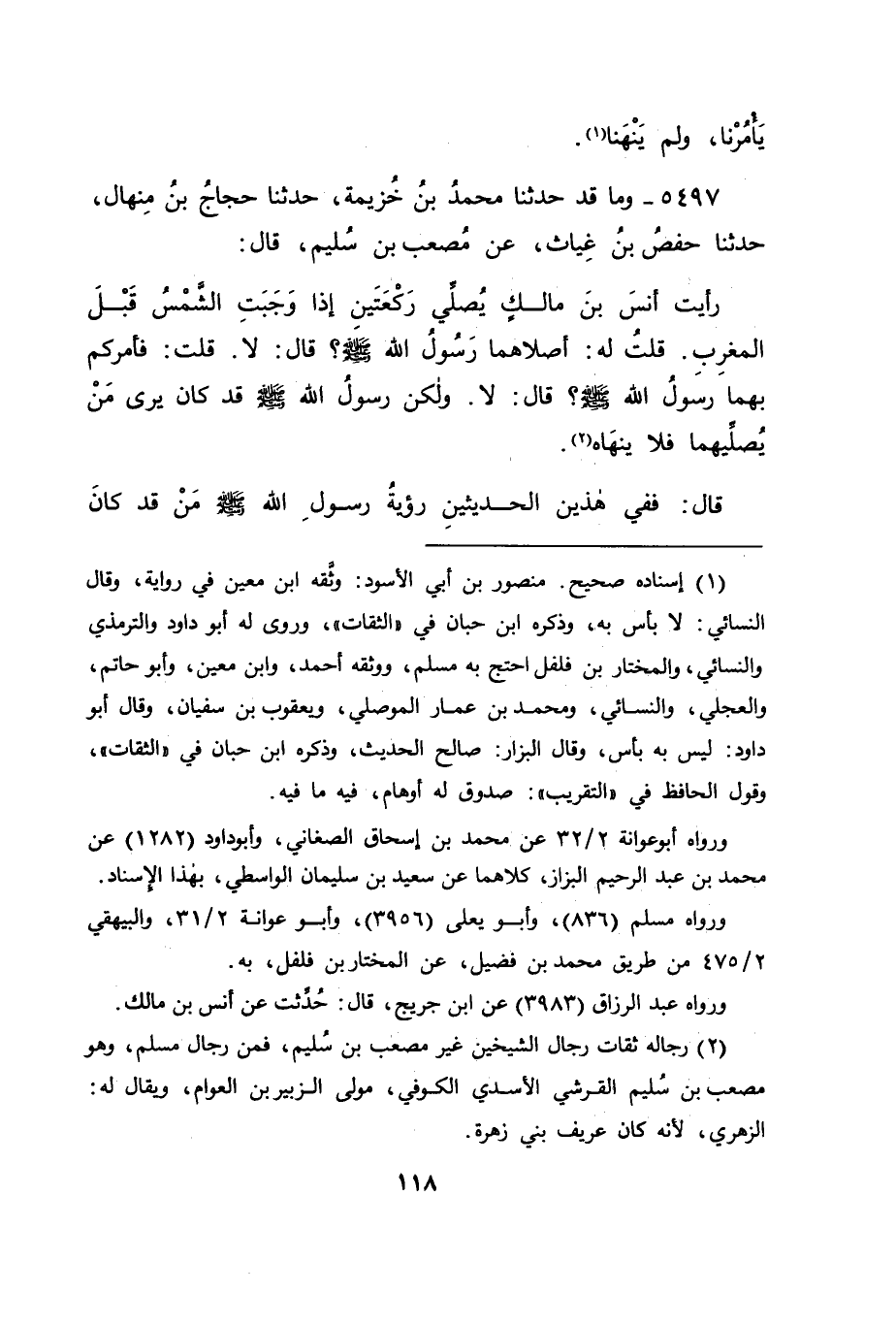 5497 - وَمَا قَدْ حَدَّثَنَا مُحَمَّدُ بْنُ خُزَيْمَةَ، حَدَّثَنَا حَجَّاجُ بْنُ مِنْهَالٍ، حَدَّثَنَا حَفْصُ بْنُ غِيَاثٍ، عَنْ مُصْعَبِ بْنِ سُلَيْمٍ قَالَ: رَأَيْتُ أَنَسَ بْنَ مَالِكٍ يُصَلِّي رَكْعَتَيْنِ إِذَا وَجَبَتِ الشَّمْسُ قَبْلَ الْمَغْرِبِ، قُلْتُ لَهُ: أَصَلَّاهُمَا رَسُولُ اللهِ صَلَّى اللَّهُ عَلَيْهِ وَسَلَّمَ؟ قَالَ: لَا، قُلْتُ: فَأَمَرَكُمْ بِهِمَا رَسُولُ اللهِ صَلَّى اللَّهُ عَلَيْهِ وَسَلَّمَ؟ قَالَ: لَا، وَلَكِنَّ رَسُولَ اللهِ صَلَّى اللَّهُ عَلَيْهِ وَسَلَّمَ قَدْ كَانَ يَرَى مَنْ يُصَلِّيهِمَا فَلَا يَنْهَاهُ قَالَ: فَفِي هَذَيْنِ الْحَدِيثَيْنِ رُؤْيَةُ رَسُولِ اللهِ صَلَّى اللَّهُ عَلَيْهِ وَسَلَّمَ مَنْ قَدْ كَانَ -[119]- يُصَلِّيهِمَا، وَتَرْكُهُ النَّهْيَ لَهُ عَنْ ذَلِكَ. فَكَانَ جَوَابَنَا لَهُ فِي ذَلِكَ: أَنَّهُ قَدْ يُحْتَمَلُ أَنْ يَكُونَا كَانَتَا مِمَّا قَدْ كَانَ لَهُمْ أَنْ يَفْعَلُوهُ حَتَّى نُسِخَ ذَلِكَ بِمَا فِي حَدِيثِ حَيَّانَ، عَنِ ابْنِ بُرَيْدَةَ، عَنْ أَبِيهِ , قَالَ: وَقَدْ رُوِيَ عَنْ أَنَسٍ فِي ذَلِكَ أَيْضًا