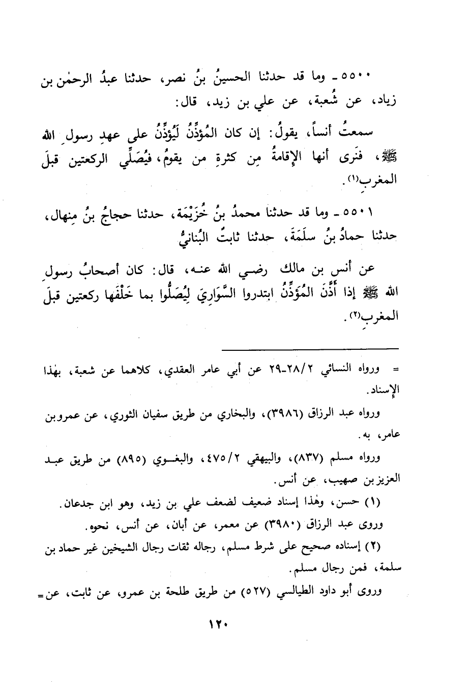 5500 - وَمَا قَدْ حَدَّثَنَا الْحُسَيْنُ بْنُ نَصْرٍ، حَدَّثَنَا عَبْدُ الرَّحْمَنِ بْنُ زِيَادٍ، عَنْ شُعْبَةَ، عَنْ عَلِيِّ بْنِ زَيْدٍ قَالَ: سَمِعْتُ أَنَسًا يَقُولُ: " إِنْ كَانَ الْمُؤَذِّنُ لَيُؤَذِّنُ عَلَى عَهْدِ رَسُولِ اللهِ صَلَّى اللَّهُ عَلَيْهِ وَسَلَّمَ، فَنَرَى أَنَّهَا الْإِقَامَةُ مِنْ كَثْرَةِ مَنْ يَقُومُ , فَيُصَلِّي الرَّكْعَتَيْنِ قَبْلَ الْمَغْرِبِ "