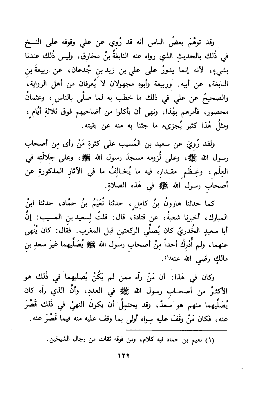 كَمَا حَدَّثَنَا هَارُونُ بْنُ كَامِلٍ، حَدَّثَنَا نُعَيْمُ بْنُ حَمَّادٍ، حَدَّثَنَا ابْنُ الْمُبَارَكِ، أَخْبَرَنَا شُعْبَةُ، عَنْ قَتَادَةَ قَالَ: قُلْتُ لِسَعِيدِ بْنِ الْمُسَيِّبِ: إِنَّ أَبَا سَعِيدٍ الْخُدْرِيَّ كَانَ يُصَلِّي الرَّكْعَتَيْنِ قَبْلَ الْمَغْرِبِ، فَقَالَ: " كَانَ يَنْهَى عَنْهُمَا، وَلَمْ أُدْرِكْ أَحَدًا مِنْ أَصْحَابِ رَسُولِ اللهِ صَلَّى اللَّهُ عَلَيْهِ وَسَلَّمَ يُصَلِّيهِمَا غَيْرَ سَعْدِ بْنِ مَالِكٍ رَضِيَ اللهُ عَنْهُ " وَكَانَ فِي هَذَا: أَنَّ مَنْ رَآهُ مِمَّنْ لَمْ يَكُنْ يُصَلِّيهِمَا فِي ذَلِكَ هُوَ الْأَكْثَرُ مِنْ أَصْحَابِ رَسُولِ اللهِ صَلَّى اللَّهُ عَلَيْهِ وَسَلَّمَ فِي الْعَدَدِ، وَأَنَّ الَّذِي رَآهُ كَانَ يُصَلِّيهِمَا مِنْهُمْ هُوَ سَعْدٌ، وَقَدْ يُحْتَمَلُ أَنْ يَكُونَ النَّهْيُ فِي ذَلِكَ قَصَّرَ عَنْهُ. فَكَانَ مَنْ وَقَفَ عَلَيْهِ سِوَاهُ أَوْلَى بِمَا وَقَفَ عَلَيْهِ مِنْهُ فِيمَا قَصَّرَ عَنْهُ، -[123]- وَقَدْ رُوِيَ عَنْ إِبْرَاهِيمَ فِي ذَلِكَ - وَمَوْضِعُهُ فِي الْعِلْمِ مَوْضِعُهُ وَخِبْرَتُهُ بِأَصْحَابِ عَبْدِ اللهِ خِبْرَتُهُ