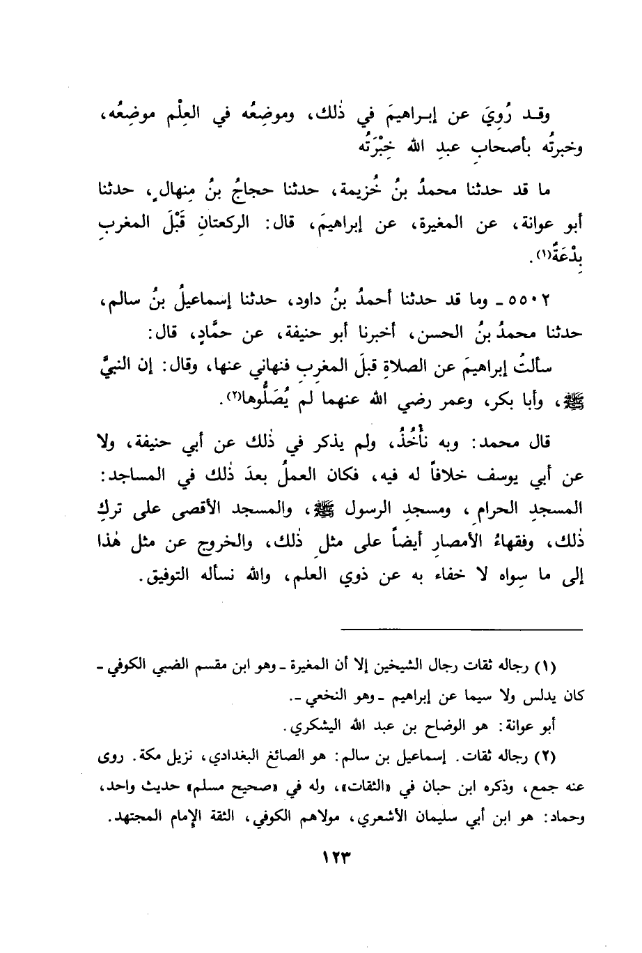 5502 - وَمَا قَدْ حَدَّثَنَا أَحْمَدُ بْنُ دَاوُدَ، حَدَّثَنَا إِسْمَاعِيلُ بْنُ سَالِمٍ، حَدَّثَنَا مُحَمَّدُ بْنُ الْحَسَنِ، أَخْبَرَنَا أَبُو حَنِيفَةَ، عَنْ حَمَّادٍ قَالَ: سَأَلْتُ إِبْرَاهِيمَ عَنِ الصَّلَاةِ، قَبْلَ الْمَغْرِبِ , فَنَهَانِي عَنْهَا، وَقَالَ: " إِنَّ النَّبِيَّ صَلَّى اللَّهُ عَلَيْهِ وَسَلَّمَ، وَأَبَا بَكْرٍ، وَعُمَرَ رَضِيَ اللهُ عَنْهُمَا لَمْ يُصَلُّوهَا " قَالَ مُحَمَّدٌ: وَبِهِ نَأْخُذُ، وَلَمْ يَذْكُرْ فِي ذَلِكَ عَنْ أَبِي حَنِيفَةَ، وَلَا عَنْ أَبِي يُوسُفَ خِلَافًا لَهُ فِيهِ، فَكَانَ الْعَمَلُ بَعْدَ ذَلِكَ فِي الْمَسَاجِدِ: الْمَسْجِدِ الْحَرَامِ، وَمَسْجِدِ الرَّسُولِ صَلَّى اللَّهُ عَلَيْهِ وَسَلَّمَ، وَالْمَسْجِدِ الْأَقْصَى عَلَى تَرْكِ ذَلِكَ، وَفُقَهَاءُ الْأَمْصَارِ أَيْضًا عَلَى مِثْلِ ذَلِكَ، وَالْخُرُوجُ عَنْ مِثْلِ هَذَا إِلَى مَا سِوَاهُ لَا خَفَاءَ بِهِ عَنْ ذَوِي الْعِلْمِ، وَاللهَ نَسْأَلُهُ التَّوْفِيقَ