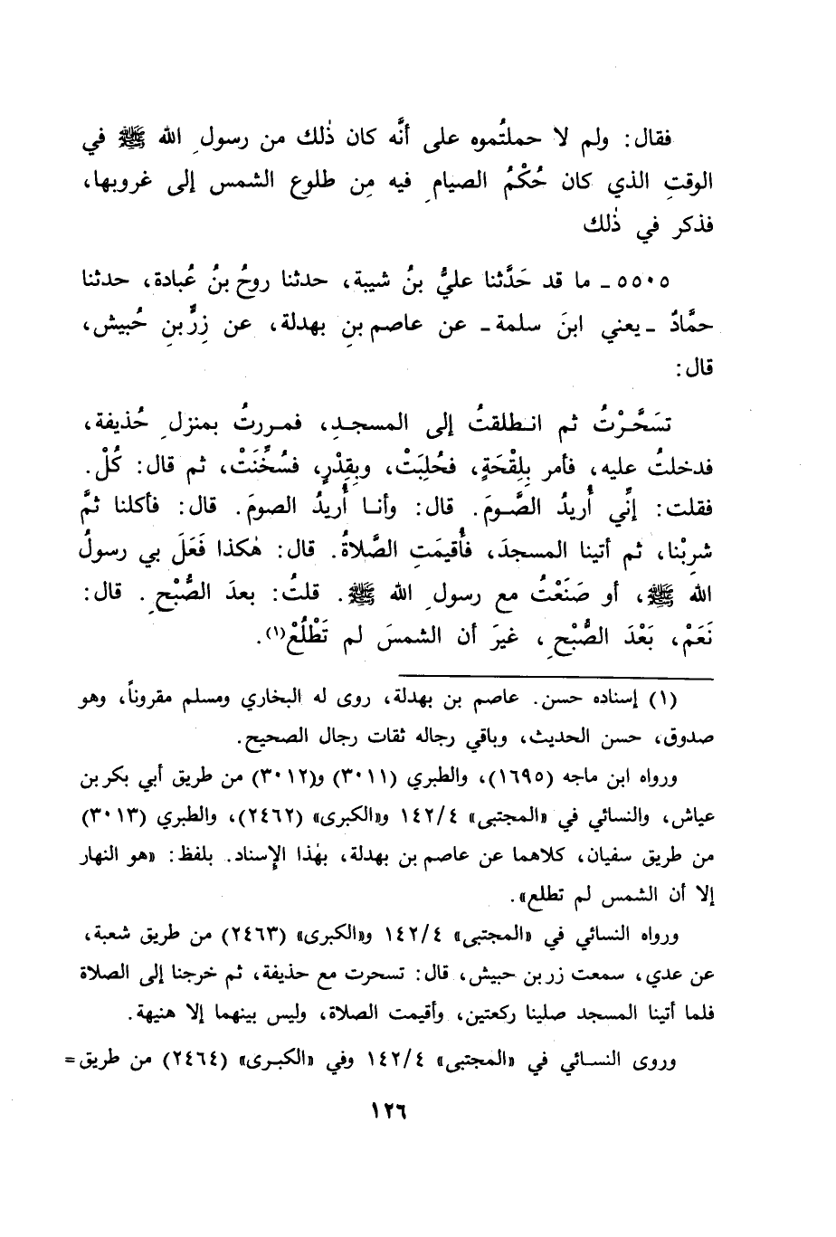 5505 - مَا قَدْ حَدَّثَنَا عَلِيُّ بْنُ شَيْبَةَ، حَدَّثَنَا رَوْحُ بْنُ عُبَادَةَ، حَدَّثَنَا حَمَّادٌ يَعْنِي ابْنَ سَلَمَةَ، عَنْ عَاصِمِ ابْنِ بَهْدَلَةَ، عَنْ زِرِّ بْنِ حُبَيْشٍ قَالَ: تَسَحَّرْتُ ثُمَّ انْطَلَقْتُ إِلَى الْمَسْجِدِ، فَمَرَرْتُ بِمَنْزِلِ حُذَيْفَةَ، فَدَخَلْتُ عَلَيْهِ، فَأَمَرَ بِلِقْحَةٍ فَحُلِبَتْ، وَبِقِدْرٍ فَسُخِّنَتْ، ثُمَّ قَالَ: " كُلْ، فَقُلْتُ: إِنِّي أُرِيدُ الصَّوْمَ قَالَ: فَأَكَلْنَا ثُمَّ شَرِبْنَا، ثُمَّ أَتَيْنَا الْمَسْجِدَ، فَأُقِيمَتِ الصَّلَاةُ قَالَ: هَكَذَا فَعَلَ بِي رَسُولُ اللهِ صَلَّى اللَّهُ عَلَيْهِ وَسَلَّمَ، أَوْ صَنَعْتُ مَعَ رَسُولِ اللهِ صَلَّى اللَّهُ عَلَيْهِ وَسَلَّمَ، قُلْتُ: بَعْدَ الصُّبْحِ؟ قَالَ: نَعَمْ، بَعْدَ الصُّبْحِ، غَيْرَ أَنَّ الشَّمْسَ لَمْ تَطْلُعْ " -[127]- قَالَ: فَكَانَ فِي هَذَا الْحَدِيثِ: أَنَّ ذَلِكَ الطَّعَامَ الَّذِي كَانَ مِنْ رَسُولِ اللهِ صَلَّى اللَّهُ عَلَيْهِ وَسَلَّمَ كَانَ بَعْدَ طُلُوعِ الْفَجْرِ، فَسَمَّاهُ غَدَاءً عَلَى مَا فِي الْحَدِيثَيْنِ الْأَوَّلَيْنِ. فَكَانَ جَوَابَنَا لَهُ فِي ذَلِكَ: أَنَّهُ قَدْ يُحْتَمَلُ أَنْ يَكُونَ ذَلِكَ كَمَا ذَكَرْتَ، وَأَنَّ ذَلِكَ الطَّعَامَ غَدَاءٌ، وَتَصْحِيحُ مَا فِي هَذَا الْحَدِيثِ، وَمَا فِي الْحَدِيثَيْنِ الْأَوَّلَيْنِ: أَنْ يَكُونَ ذِكْرُ السُّحُورِ، وَإِنْ كَانَ بَعْدَ طُلُوعِ الْفَجْرِ يُسَمَّى سُحُورًا، وَإِنْ كَانَ غَدَاءً لِقُرْبِهِ مِنَ السُّحُورِ، وَمَا فِي الْحَدِيثِ الْآخَرِ مِنَ الْغَدَاءِ إِنْ كَانَ قَبْلَ طُلُوعِ الْفَجْرِ سُمِّيَ غَدَاءً لِقُرْبِهِ مِنَ الْغَدَاءِ، فَهَذَا أَوْلَى مَا حُمِلَتْ عَلَيْهِ هَذِهِ الْآثَارُ، حَتَّى لَا يَدْفَعَ شَيْءٌ مِنْهَا شَيْئًا، وَلَا يُضَادَّ شَيْءٌ مِنْهَا شَيْئًا، وَاللهَ نَسْأَلُهُ التَّوْفِيقَ