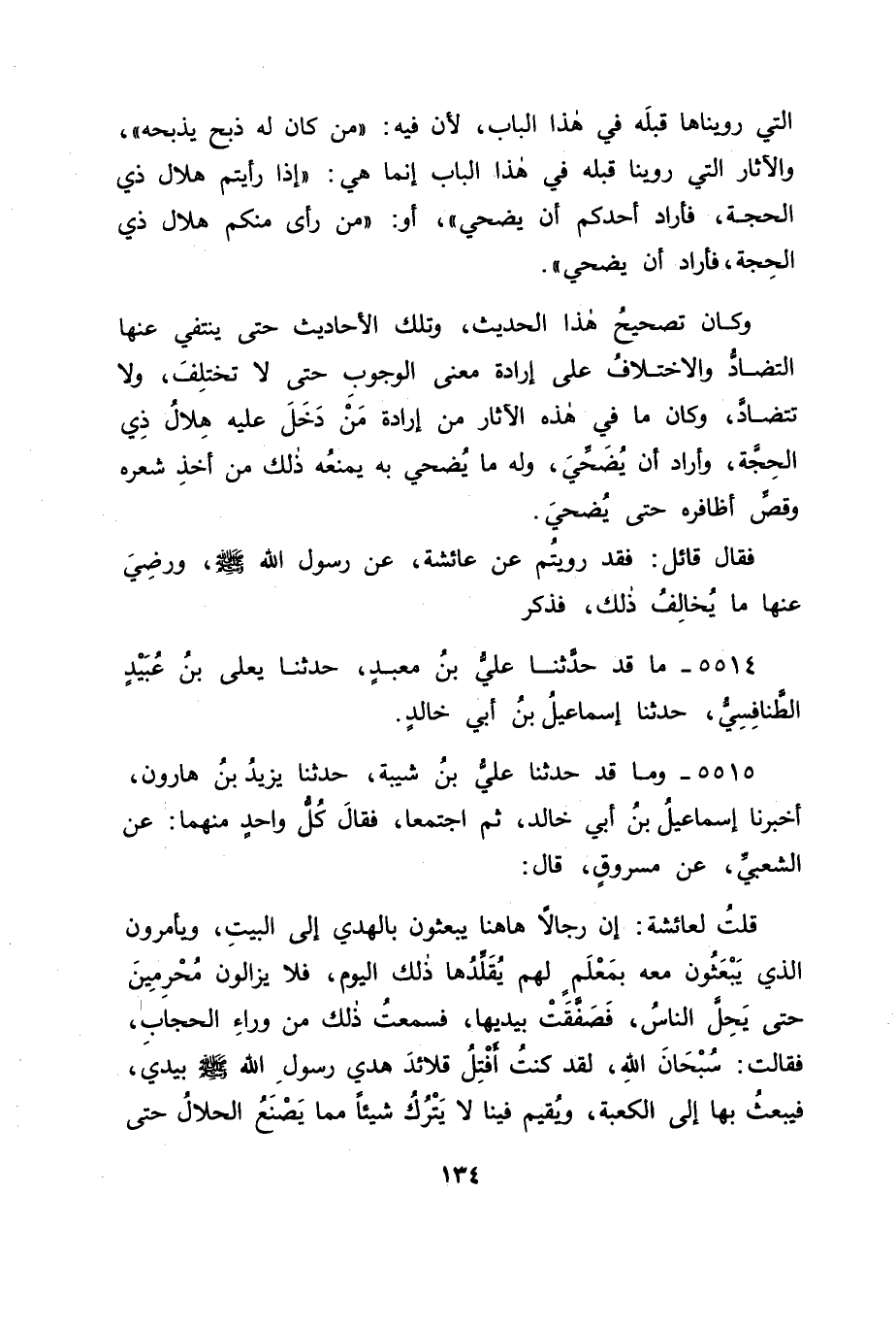 5515 - وَمَا قَدْ حَدَّثَنَا عَلِيُّ بْنُ شَيْبَةَ، حَدَّثَنَا يَزِيدُ بْنُ هَارُونَ، أَخْبَرَنَا إِسْمَاعِيلُ بْنُ أَبِي خَالِدٍ، ثُمَّ اجْتَمَعَا، فَقَالَ كُلُّ وَاحِدٍ مِنْهُمَا: عَنِ الشَّعْبِيِّ، عَنْ مَسْرُوقٍ قَالَ: قُلْتُ لِعَائِشَةَ: إِنَّ رِجَالًا هَاهُنَا يَبْعَثُونَ بِالْهَدْيِ إِلَى الْبَيْتِ، وَيَأْمُرُونَ الَّذِي يَبْعَثُونَ مَعَهُ بِمَعْلَمٍ لَهُمْ يُقَلِّدُهَا ذَلِكَ الْيَوْمَ، فَلَا يَزَالُونَ مُحْرِمِينَ حَتَّى يَحِلَّ النَّاسُ، فَصَفَّقَتْ بِيَدَيْهَا، فَسَمِعْتُ ذَلِكَ مِنْ وَرَاءِ الْحِجَابِ، فَقَالَتْ: " سُبْحَانَ اللهِ، لَقَدْ كُنْتُ أَفْتِلُ قَلَائِدَ هَدْيِ رَسُولِ اللهِ صَلَّى اللَّهُ عَلَيْهِ وَسَلَّمَ بِيَدِي، فَيَبْعَثُ بِهَا إِلَى الْكَعْبَةِ، وَيُقِيمُ فِينَا لَا يَتْرُكُ شَيْئًا مِمَّا يَصْنَعُ الْحَلَالُ حَتَّى -[135]- يَرْجِعَ النَّاسُ "