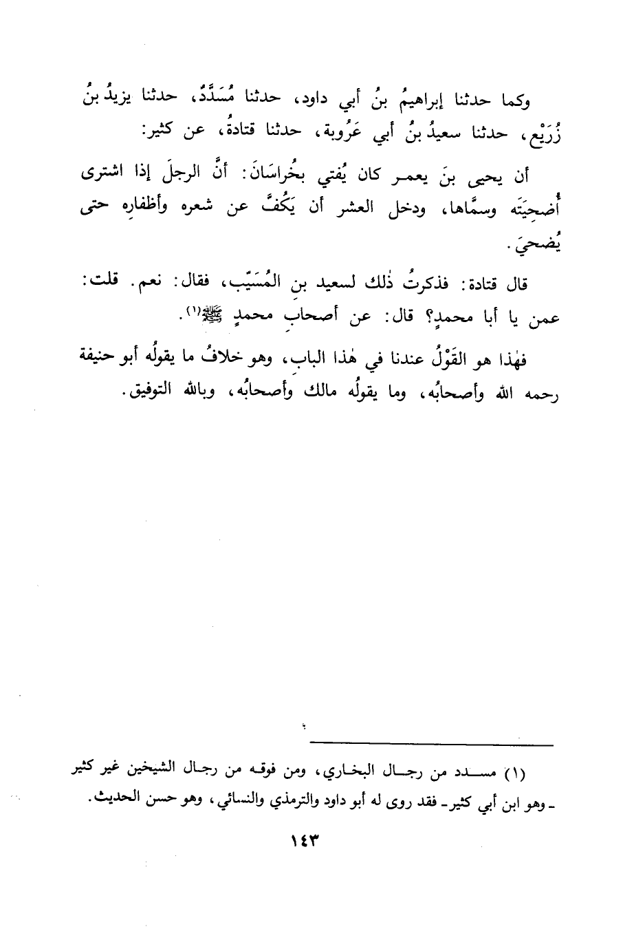 وَكَمَا حَدَّثَنَا إِبْرَاهِيمُ بْنُ أَبِي دَاوُدَ، حَدَّثَنَا مُسَدَّدٌ، حَدَّثَنَا يَزِيدُ بْنُ زُرَيْعٍ، حَدَّثَنَا سَعِيدُ بْنُ أَبِي عَرُوبَةَ، حَدَّثَنَا قَتَادَةُ، عَنْ كَثِيرٍ , أَنَّ يَحْيَى بْنَ يَعْمَرَ كَانَ يُفْتِي بِخُرَاسَانَ: أَنَّ الرَّجُلَ إِذَا اشْتَرَى أُضْحِيَّتَهُ وَسَمَّاهَا، وَدَخَلَ الْعَشْرُ أَنْ يَكُفَّ عَنْ شَعْرِهِ وَأَظْفَارِهِ حَتَّى يُضَحِّيَ. قَالَ قَتَادَةُ: فَذَكَرْتُ ذَلِكَ لِسَعِيدِ بْنِ الْمُسَيِّبِ، فَقَالَ: نَعَمْ، قُلْتُ: عَمَّنْ يَا أَبَا مُحَمَّدٍ؟ قَالَ: عَنْ أَصْحَابِ مُحَمَّدٍ صَلَّى اللَّهُ عَلَيْهِ وَسَلَّمَ " فَهَذَا هُوَ الْقَوْلُ عِنْدَنَا فِي هَذَا الْبَابِ، وَهُوَ خِلَافُ مَا يَقُولُهُ أَبُو حَنِيفَةَ رَحِمَهُ اللهُ وَأَصْحَابُهُ، وَمَا يَقُولُهُ مَالِكٌ وَأَصْحَابُهُ، وَبِاللهِ التَّوْفِيقُ.