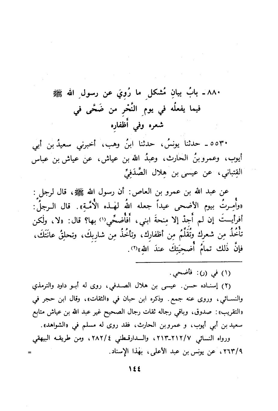 5530 - حَدَّثَنَا يُونُسُ، حَدَّثَنَا ابْنُ وَهْبٍ، أَخْبَرَنِي سَعِيدُ بْنُ أَبِي أَيُّوبَ، وَعَمْرُو بْنُ الْحَارِثِ، وَعَبْدُ اللهِ بْنُ عَيَّاشٍ، عَنْ عَيَّاشِ بْنِ عَبَّاسٍ الْقِتْبَانِيِّ، عَنْ عِيسَى بْنِ هِلَالٍ الصَّدَفِيِّ، عَنْ عَبْدِ اللهِ بْنِ عَمْرِو بْنِ الْعَاصِ، أَنَّ رَسُولَ اللهِ صَلَّى اللَّهُ عَلَيْهِ وَسَلَّمَ قَالَ لِرَجُلٍ: " وَأُمِرْتُ بِيَوْمِ الْأَضْحَى عِيدًا , جَعَلَهُ اللهُ لِهَذِهِ الْأُمَّةِ " قَالَ الرَّجُلُ: أَفَرَأَيْتَ إِنْ لَمْ أَجِدْ إِلَّا مِنْحَةَ ابْنِي، أَفَأُضَحِّي بِهَا؟ قَالَ: " لَا، وَلَكِنْ تَأْخُذُ مِنْ شَعْرِكَ , وَتُقَلِّمُ مِنْ أَظْفَارِكَ، وَتَأْخُذُ مِنْ شَارِبِكَ، وَتَحْلِقُ عَانَتَكَ، فَإِنَّ ذَلِكَ تَمَامُ أُضْحِيَّتِكَ عِنْدَ اللهِ " -[145]-