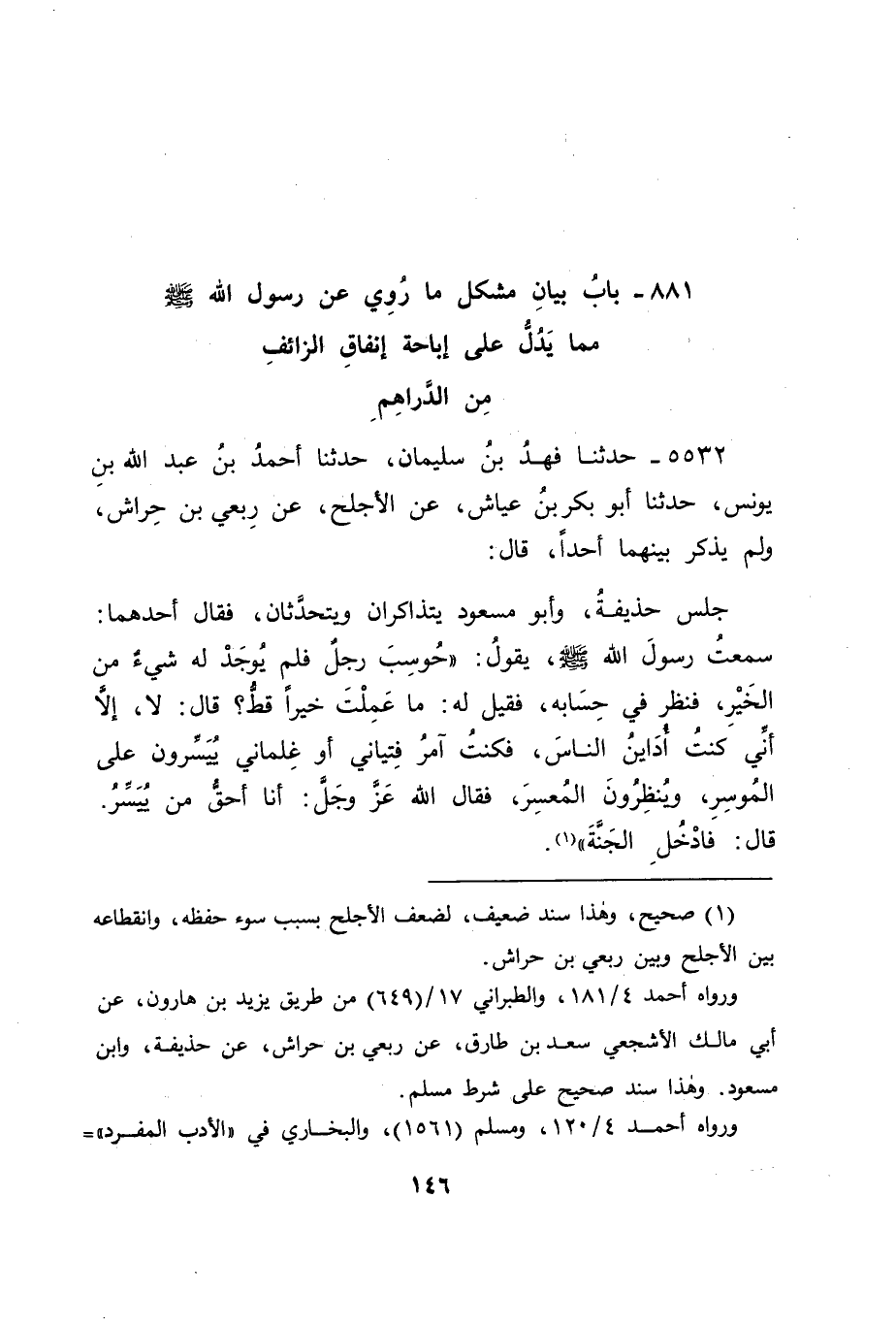 5532 - حَدَّثَنَا فَهْدُ بْنُ سُلَيْمَانَ، حَدَّثَنَا أَحْمَدُ بْنُ عَبْدِ اللهِ بْنِ يُونُسَ، حَدَّثَنَا أَبُو بَكْرِ بْنُ عَيَّاشٍ، عَنِ الْأَجْلَحِ، عَنْ رِبْعِيِّ بْنِ حِرَاشٍ، وَلَمْ يَذْكُرْ بَيْنَهُمَا أَحَدًا قَالَ: جَلَسَ حُذَيْفَةُ، وَأَبُو مَسْعُودٍ يَتَذَاكَرَانِ، وَيَتَحَدَّثَانِ، فَقَالَ أَحَدُهُمَا: سَمِعْتُ رَسُولَ اللهِ صَلَّى اللَّهُ عَلَيْهِ وَسَلَّمَ يَقُولُ: " حُوسِبَ رَجُلٌ فَلَمْ يُوجَدْ لَهُ شَيْءٌ مِنَ الْخَيْرِ، فَنُظِرَ فِي حِسَابِهِ، فَقِيلَ لَهُ: مَا عَمِلْتَ خَيْرًا قَطُّ؟ قَالَ: لَا، إِلَّا أَنِّي كُنْتُ أُدَايِنُ النَّاسَ، فَكُنْتُ آمُرُ فِتْيَانِي أَوْ غِلْمَانِي يُيَسِّرُونَ عَلَى الْمُوسِرِ، وَيُنْظِرُونَ الْمُعْسِرَ، فَقَالَ اللهُ عَزَّ وَجَلَّ: أَنَا أَحَقُّ مَنْ يُيَسِّرُ قَالَ: فَادْخُلِ الْجَنَّةَ " -[147]- قَالَ أَبُو جَعْفَرٍ: هَكَذَا حَدَّثَنَا فَهْدُ بْنُ سُلَيْمَانَ هَذَا الْحَدِيثَ بِغَيْرِ ذِكْرٍ مِنْهُ بَيْنَ الْأَجْلَحِ وَبَيْنِ رِبْعِيٍّ أَحَدًا