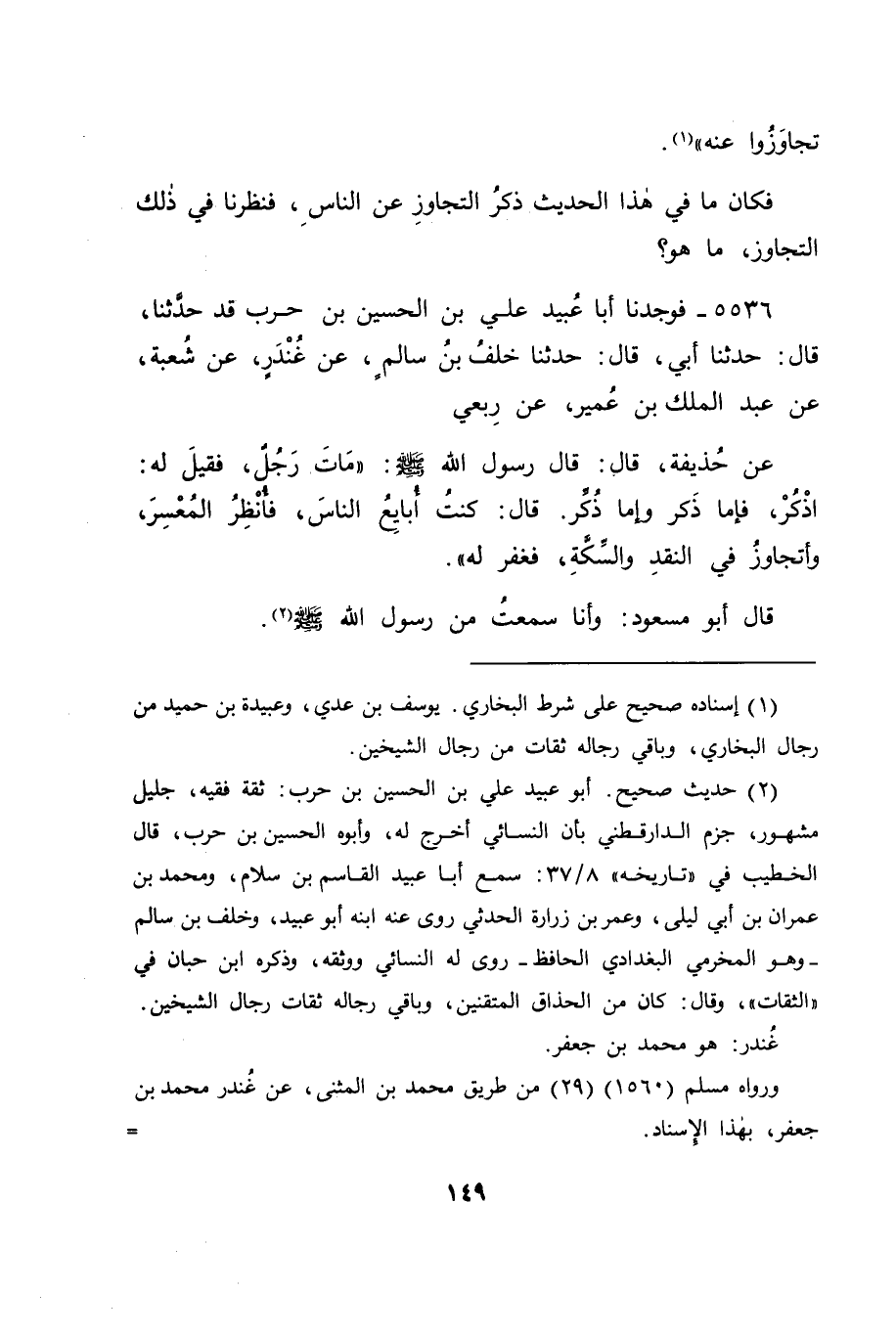 5536 - فَوَجَدْنَا أَبَا عُبَيْدٍ عَلِيَّ بْنَ الْحُسَيْنِ بْنِ حَرْبٍ قَدْ حَدَّثَنَا قَالَ: حَدَّثَنَا أَبِي قَالَ: حَدَّثَنَا خَلَفُ بْنُ سَالِمٍ، عَنْ غُنْدَرٍ، عَنْ شُعْبَةَ، عَنْ عَبْدِ الْمَلِكِ بْنِ عُمَيْرٍ، عَنْ رِبْعِيٍّ، عَنْ حُذَيْفَةَ قَالَ: قَالَ رَسُولُ اللهِ صَلَّى اللَّهُ عَلَيْهِ وَسَلَّمَ: " مَاتَ رَجُلٌ، فَقِيلَ لَهُ: اذْكُرْ، فَإِمَّا ذَكَرَ وَإِمَّا ذُكِّرَ قَالَ: كُنْتُ أُبَايِعُ النَّاسَ، فَأُنْظِرُ الْمُعْسِرَ، وَأَتَجَاوَزُ فِي النَّقْدِ وَالسِّكَّةِ، فَغُفِرَ لَهُ ". قَالَ أَبُو مَسْعُودٍ: وَأَنَا سَمِعْتُ مِنْ رَسُولِ اللهِ صَلَّى اللَّهُ عَلَيْهِ وَسَلَّمَ. -[150]- قَالَ أَبُو جَعْفَرٍ: