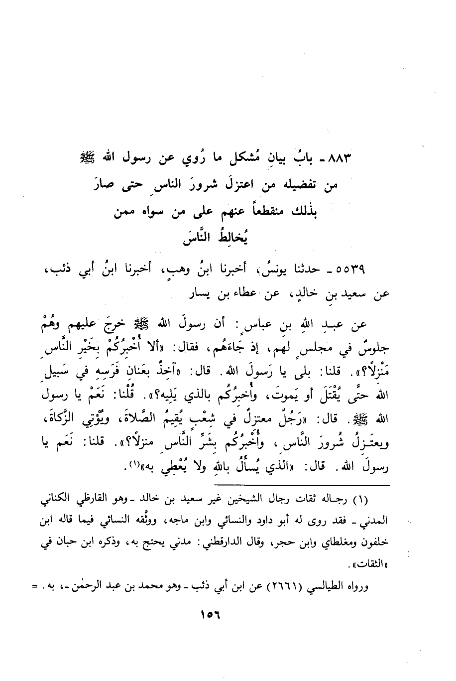 5539 - حَدَّثَنَا يُونُسُ، أَخْبَرَنَا ابْنُ وَهْبٍ، أَخْبَرَنَا ابْنُ أَبِي ذِئْبٍ، عَنْ سَعِيدِ بْنِ خَالِدٍ، عَنْ عَطَاءِ بْنِ يَسَارٍ، عَنْ عَبْدِ اللهِ بْنِ عَبَّاسٍ، أَنَّ رَسُولَ اللهِ صَلَّى اللَّهُ عَلَيْهِ وَسَلَّمَ خَرَجَ عَلَيْهِمْ وَهُمْ جُلُوسٌ فِي مَجْلِسٍ لَهُمْ، إِذْ جَاءَهُمْ، فَقَالَ: " أَلَا أُخْبِرُكُمْ بِخَيْرِ النَّاسِ مَنْزِلًا؟ "، قُلْنَا: بَلَى يَا رَسُولَ اللهِ , قَالَ: " آخِذٌ بِعِنَانِ فَرَسِهِ فِي سَبِيلِ اللهِ حَتَّى يُقْتَلَ أَوْ يَمُوتَ، وَأُخْبِرُكُمْ بِالَّذِي يَلِيهِ؟ ". قُلْنَا: نَعَمْ يَا رَسُولَ اللهِ صَلَّى اللَّهُ عَلَيْهِ وَسَلَّمَ قَالَ: " رَجُلٌ مُعْتَزِلٌ فِي شِعْبٍ يُقِيمُ الصَّلَاةَ، وَيُؤْتِي الزَّكَاةَ، وَيَعْتَزِلُ شُرُورَ النَّاسِ، وَأُخْبِرُكُمْ بِشَرِّ النَّاسِ مَنْزِلًا؟ "، قُلْنَا: نَعَمْ يَا رَسُولَ اللهِ قَالَ: " الَّذِي يُسْأَلُ بِاللهِ وَلَا يُعْطِي بِهِ " -[157]- هَكَذَا حَدَّثَنَا يُونُسُ هَذَا الْحَدِيثَ، فَقَالَ فِي إِسْنَادِهِ: عَنِ ابْنِ أَبِي ذِئْبٍ، عَنْ سَعِيدِ بْنِ خَالِدٍ، عَنْ عَطَاءِ بْنِ يَسَارٍ، عَنِ ابْنِ عَبَّاسٍ، وَقَدْ خُولِفَ عَنْ غَيْرِ ابْنِ وَهْبٍ فِي إِسْنَادِهِ