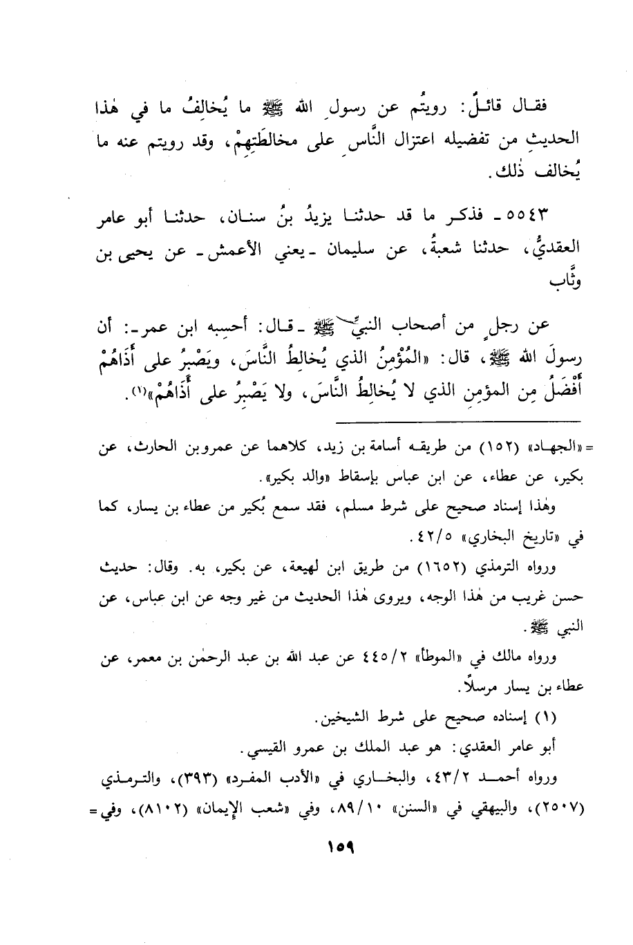 5543 - فَذَكَرَ مَا قَدْ حَدَّثَنَا يَزِيدُ بْنُ سِنَانٍ، حَدَّثَنَا أَبُو عَامِرٍ الْعَقَدِيُّ، حَدَّثَنَا شُعْبَةُ، عَنْ سُلَيْمَانَ يَعْنِي الْأَعْمَشَ، عَنْ يَحْيَى بْنِ وَثَّابٍ، عَنْ رَجُلٍ مِنْ أَصْحَابِ النَّبِيِّ صَلَّى اللَّهُ عَلَيْهِ وَسَلَّمَ - قَالَ: أَحْسِبُهُ ابْنَ عُمَرَ -: أَنَّ رَسُولَ اللهِ صَلَّى اللَّهُ عَلَيْهِ وَسَلَّمَ قَالَ: " الْمُؤْمِنُ الَّذِي يُخَالِطُ النَّاسَ، وَيَصْبِرُ عَلَى أَذَاهُمْ أَفْضَلُ مِنَ الْمُؤْمِنِ الَّذِي لَا يُخَالِطُ النَّاسَ، وَلَا يَصْبِرُ عَلَى أَذَاهُمْ "