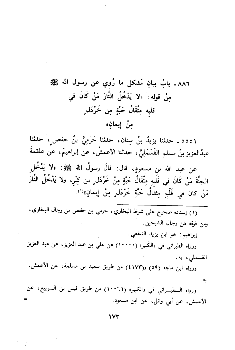 5551 - حَدَّثَنَا يَزِيدُ بْنُ سِنَانٍ، حَدَّثَنَا حَرَمِيُّ بْنُ حَفْصٍ، حَدَّثَنَا عَبْدُ الْعَزِيزِ بْنُ مُسْلِمٍ الْقَسْمَلِيُّ، حَدَّثَنَا الْأَعْمَشُ، عَنْ إِبْرَاهِيمَ، عَنْ عَلْقَمَةَ، عَنْ عَبْدِ اللهِ بْنِ مَسْعُودٍ قَالَ: قَالَ رَسُولُ اللهِ صَلَّى اللَّهُ عَلَيْهِ وَسَلَّمَ: " لَا يَدْخُلُ الْجَنَّةَ مَنْ كَانَ فِي قَلْبِهِ مِثْقَالُ حَبَّةٍ مِنْ خَرْدَلٍ مِنْ كِبْرٍ، وَلَا يَدْخُلُ النَّارَ مَنْ كَانَ فِي قَلْبِهِ مِثْقَالُ حَبَّةِ خَرْدَلٍ مِنْ إِيمَانٍ " -[174]-
