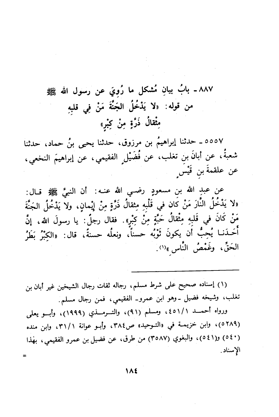 5557 - حَدَّثَنَا إِبْرَاهِيمُ بْنُ مَرْزُوقٍ، حَدَّثَنَا يَحْيَى بْنُ حَمَّادٍ، حَدَّثَنَا شُعْبَةُ، عَنْ أَبَانَ بْنِ تَغْلِبَ، عَنْ فُضَيْلٍ الْفُقَيْمِيِّ، عَنْ إِبْرَاهِيمَ النَّخَعِيِّ، عَنْ عَلْقَمَةَ بْنِ قَيْسٍ، عَنْ عَبْدِ اللهِ بْنِ مَسْعُودٍ رَضِيَ اللهُ عَنْهُ: أَنَّ النَّبِيَّ صَلَّى اللَّهُ عَلَيْهِ وَسَلَّمَ قَالَ: " لَا يَدْخُلُ النَّارَ مَنْ كَانَ فِي قَلْبِهِ مِثْقَالُ ذَرَّةٍ مِنْ إِيمَانٍ، وَلَا يَدْخُلُ الْجَنَّةَ مَنْ كَانَ فِي قَلْبِهِ مِثْقَالُ حَبَّةٍ مِنْ كِبْرٍ "، فَقَالَ رَجُلٌ: يَا رَسُولَ اللهِ، إِنَّ أَحَدَنَا يُحِبُّ أَنْ يَكُونَ ثَوْبُهُ حَسَنًا، وَنَعْلُهُ حَسَنَةً , قَالَ: " الْكِبْرُ بَطَرُ الْحَقِّ، وَغَمْصُ النَّاسِ " -[185]- قَالَ لَنَا إِبْرَاهِيمُ: وَحَدَّثَنَا مَرَّةً أُخْرَى، فَقَالَ: " غَمْطُ الْحَقِّ "