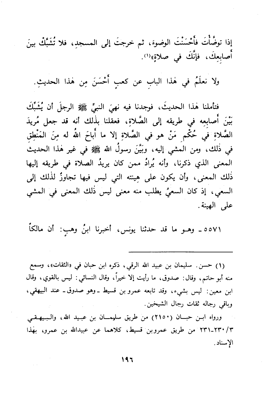 5573 - كَمَا حَدَّثَنَا صَالِحُ بْنُ عَبْدِ الرَّحْمَنِ، حَدَّثَنَا الْقَعْنَبِيُّ، حَدَّثَنَا -[199]- مَالِكٌ، عَنِ الْعَلَاءِ بْنِ عَبْدِ الرَّحْمَنِ، عَنْ أَبِيهِ، عَنْ أَبِي هُرَيْرَةَ قَالَ: قَالَ رَسُولُ اللهِ صَلَّى اللَّهُ عَلَيْهِ وَسَلَّمَ: " إِذَا ثُوِّبَ بِالصَّلَاةِ "، ثُمَّ ذَكَرَ مِثْلَهُ، غَيْرَ أَنَّهُ قَالَ: " وَمَا فَاتَكُمْ فَأَتِمُّوا ". وَلَمْ يَذْكُرْ فِي إِسْنَادِهِ إِسْحَاقَ أَبَا عَبْدِ اللهِ. فَكَانَ فِي هَذَا الْحَدِيثِ أَمْرُ رَسُولِ اللهِ صَلَّى اللَّهُ عَلَيْهِ وَسَلَّمَ النَّاسَ أَنْ يَكُونُوا فِي إِتْيَانِهِمُ الصَّلَاةَ عَلَى مَا يَكُونُونَ عَلَيْهِ مِنَ الْهِينَةِ الَّتِي يَأْتُونَهَا عَلَيْهِ، وَالَّتِي يَكُونُونَ عَلَيْهَا فِيهَا، فَمِثْلُ ذَلِكَ مَا رُوِيَ عَنْ كَعْبٍ عَنْهُ فِي النَّهْيِ عَنِ التَّشْبِيكِ بَيْنَ الْأَصَابِعِ - فِي حَالِ إِرَادَةِ الصَّلَاةِ - هُوَ كَالنَّهْيِ عَنْ مِثْلِ ذَلِكَ لِمَنْ قَدْ دَخَلَ فِيهَا، وَاللهَ نَسْأَلُهُ التَّوْفِيقَ