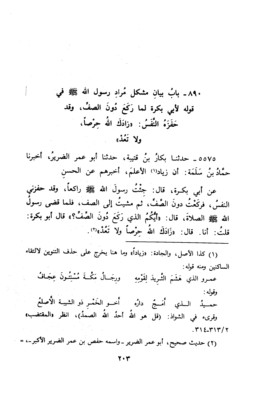 5575 - حَدَّثَنَا بَكَّارُ بْنُ قُتَيْبَةَ، حَدَّثَنَا أَبُو عُمَرَ الضَّرِيرُ، أَخْبَرَنَا حَمَّادُ بْنُ سَلَمَةَ، أَنَّ زِيَاد الْأَعْلَمَ، أَخْبَرَهُمْ، عَنِ الْحَسَنِ، عَنْ أَبِي بَكْرَةَ قَالَ: جِئْتُ رَسُولَ اللهِ صَلَّى اللَّهُ عَلَيْهِ وَسَلَّمَ رَاكِعًا، وَقَدْ حَفَزَنِي النَّفَسُ، فَرَكَعْتُ دُونَ الصَّفِّ، ثُمَّ مَشَيْتُ إِلَى الصَّفِّ، فَلَمَّا قَضَى رَسُولُ اللهِ صَلَّى اللَّهُ عَلَيْهِ وَسَلَّمَ الصَّلَاةَ قَالَ: " أَيُّكُمُ الَّذِي رَكَعَ دُونَ الصَّفِّ؟ " قَالَ أَبُو بَكْرَةَ: قُلْتُ: أَنَا قَالَ: " زَادَكَ اللهُ حِرْصًا وَلَا تَعُدْ " -[205]-
