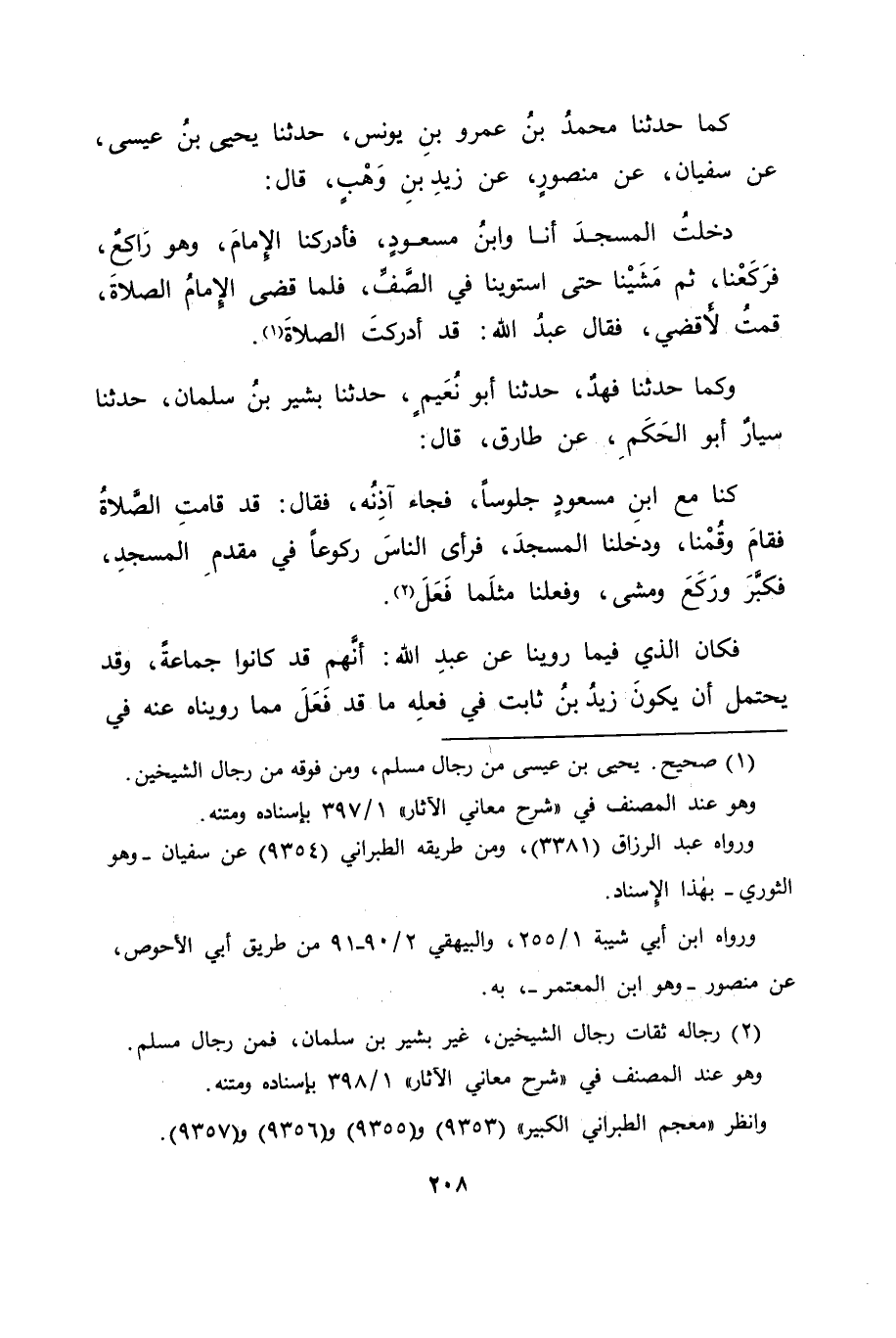 وَكَمَا حَدَّثَنَا فَهْدٌ، حَدَّثَنَا أَبُو نُعَيْمٍ، حَدَّثَنَا بَشِيرُ بْنُ سَلْمَانَ، حَدَّثَنَا سَيَّارٌ أَبُو الْحَكَمِ، عَنْ طَارِقٍ قَالَ: كُنَّا مَعَ ابْنِ مَسْعُودٍ جُلُوسًا، فَجَاءَ آذِنُهُ، فَقَالَ: " قَدْ قَامَتِ الصَّلَاةُ , فَقَامَ وَقُمْنَا، وَدَخَلْنَا الْمَسْجِدَ، فَرَأَى النَّاسَ رُكُوعًا فِي مُقَدَّمِ الْمَسْجِدِ، فَكَبَّرَ وَرَكَعَ وَمَشَى، وَفَعَلْنَا مِثْلَمَا فَعَلَ " فَكَانَ الَّذِي فِيمَا رُوِّينَا عَنْ عَبْدِ اللهِ: أَنَّهُمْ قَدْ كَانُوا جَمَاعَةً، وَقَدْ يُحْتَمَلُ أَنْ يَكُونَ زَيْدُ بْنُ ثَابِتٍ فِي فِعْلِهِ مَا قَدْ فَعَلَ مِمَّا رَوَيْنَاهُ عَنْهُ فِي -[209]- هَذَا الْبَابِ قَدْ كَانَ مَعَ غَيْرِهِ مِمَّنْ يُرِيدُ مَا يُرِيدُ، وَكَانُوا بِذَلِكَ جَمَاعَةً، وَاللهُ أَعْلَمُ بِحَقِيقَةِ الْأَمْرِ كَانَ فِي ذَلِكَ. غَيْرَ أَنَّهُ لَا يَجِبُ أَنْ يُحْمَلَ مَا كَانَ مِنْهُ عَلَى خِلَافِ مَا يُرْوَى عَنْ رَسُولِ اللهِ صَلَّى اللَّهُ عَلَيْهِ وَسَلَّمَ فِي الصَّلَاةِ دُونَ الصَّفِّ، وَهَذَا أَحْسَنُ مَا وَقَفْنَا عَلَيْهِ مِنْ تَأْوِيلِ قَوْلِ النَّبِيِّ صَلَّى اللَّهُ عَلَيْهِ وَسَلَّمَ لِأَبِي بَكْرَةَ، لِمَا كَانَ مِنْهُ مَا قَدْ رَوَيْنَا عَنْهُ فِي حَدِيثِهِ الَّذِي رَوَيْنَاهُ عَنْهُ فِي هَذَا الْبَابِ، وَبِاللهِ التَّوْفِيقُ