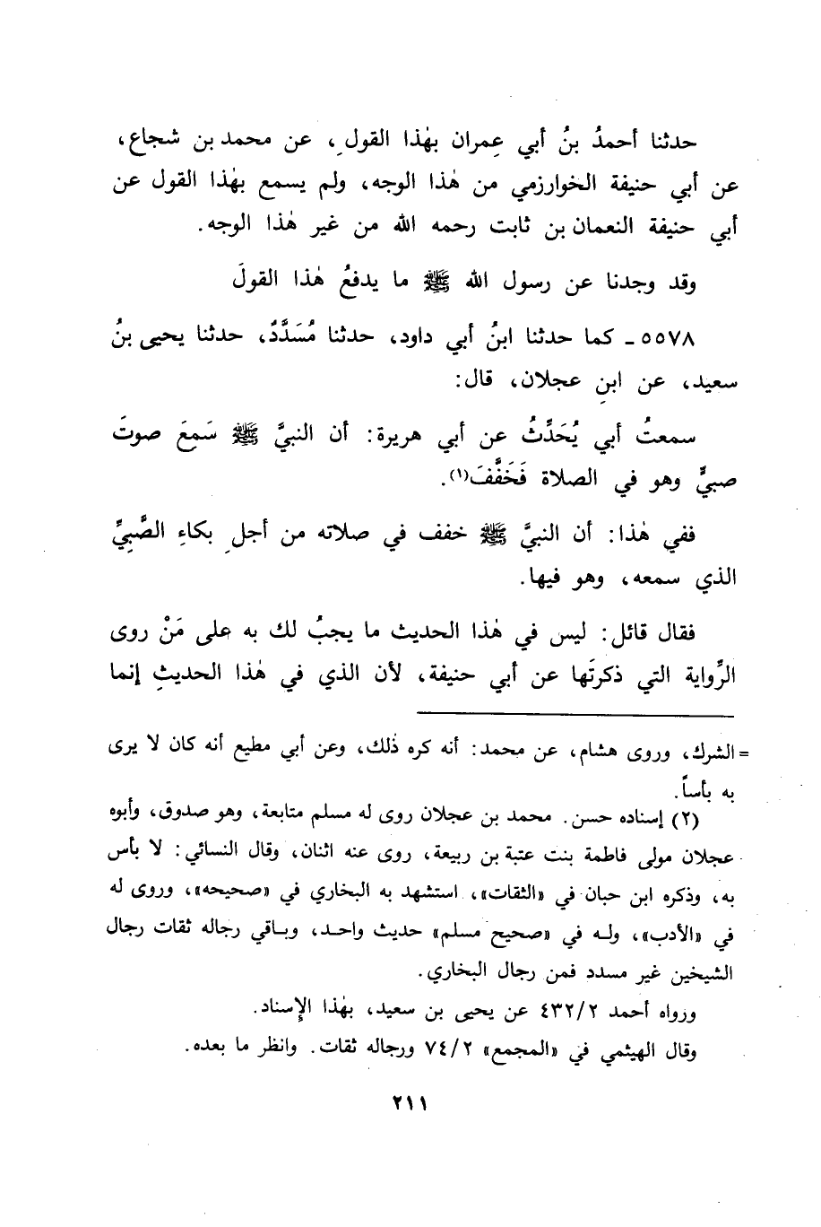 5578 - كَمَا حَدَّثَنَا ابْنُ أَبِي دَاوُدَ، حَدَّثَنَا مُسَدَّدٌ، حَدَّثَنَا يَحْيَى بْنُ سَعِيدٍ، عَنِ ابْنِ عَجْلَانَ قَالَ: سَمِعْتُ أَبِي يُحَدِّثُ، عَنْ أَبِي هُرَيْرَةَ، " أَنَّ النَّبِيَّ صَلَّى اللَّهُ عَلَيْهِ وَسَلَّمَ سَمِعَ صَوْتَ صَبِيٍّ وَهُوَ فِي الصَّلَاةِ فَخَفَّفَ " فَفِي هَذَا: أَنَّ النَّبِيَّ صَلَّى اللَّهُ عَلَيْهِ وَسَلَّمَ خَفَّفَ فِي صَلَاتِهِ مِنْ أَجْلِ بُكَاءِ الصَّبِيِّ الَّذِي سَمِعَهُ، وَهُوَ فِيهَا. فَقَالَ قَائِلٌ: لَيْسَ فِي هَذَا الْحَدِيثِ مَا يَجِبُ لَكَ بِهِ عَلَى مَنْ رَوَى الرِّوَايَةَ الَّتِي ذَكَرْتَهَا عَنْ أَبِي حَنِيفَةَ؛ لِأَنَّ الَّذِي فِي هَذَا الْحَدِيثِ إِنَّمَا -[212]- هُوَ مِنْ كَلَامِ أَبِي هُرَيْرَةَ ظَنًّا بِرَسُولِ اللهِ صَلَّى اللَّهُ عَلَيْهِ وَسَلَّمَ أَنَّ تَخْفِيفَهُ كَانَ مِنْ أَجْلِهِ، وَقَدْ دَلَّ عَلَى ذَلِكَ