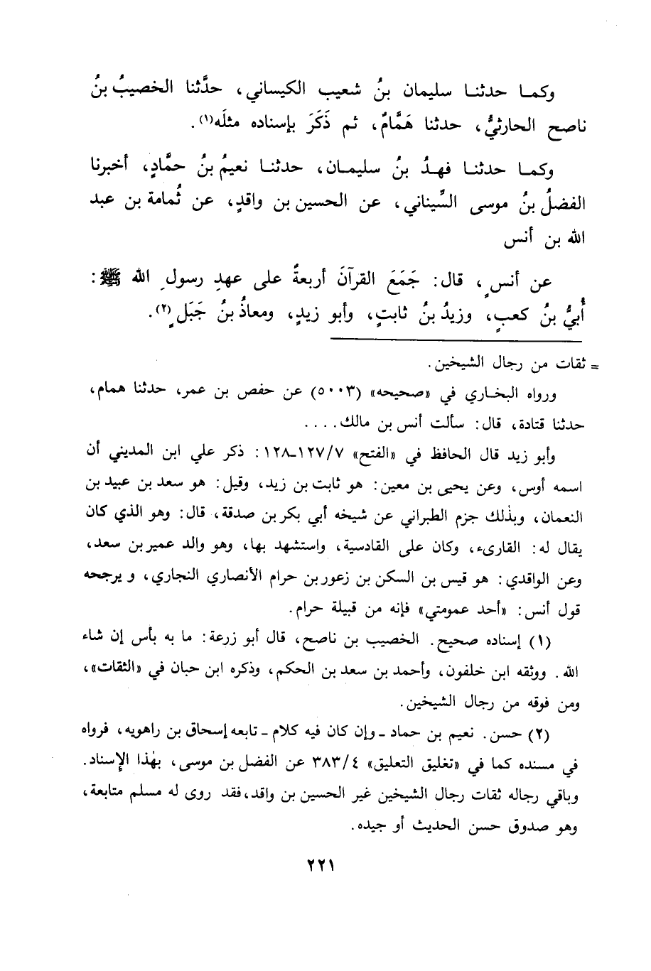 وَكَمَا حَدَّثَنَا فَهْدُ بْنُ سُلَيْمَانَ، حَدَّثَنَا نُعَيْمُ بْنُ حَمَّادٍ، أَخْبَرَنَا الْفَضْلُ بْنُ مُوسَى السِّينَانِيُّ، عَنِ الْحُسَيْنِ بْنِ وَاقِدٍ، عَنْ ثُمَامَةَ بْنِ عَبْدِ اللهِ بْنِ أَنَسٍ، عَنْ أَنَسٍ قَالَ: جَمَعَ الْقُرْآنَ أَرْبَعَةٌ عَلَى عَهْدِ رَسُولِ اللهِ صَلَّى اللَّهُ عَلَيْهِ وَسَلَّمَ: أُبَيُّ بْنُ كَعْبٍ، وَزَيْدُ بْنُ ثَابِتٍ، وَأَبُو زَيْدٍ، وَمُعَاذُ بْنُ جَبَلٍ