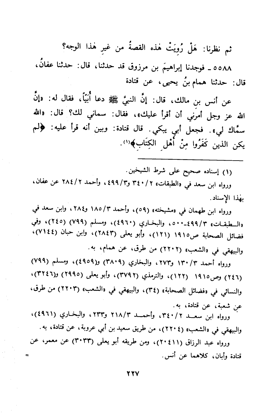 5588 - فَوَجَدْنَا إِبْرَاهِيمَ بْنَ مَرْزُوقٍ قَدْ حَدَّثَنَا قَالَ: حَدَّثَنَا عَفَّانُ قَالَ: حَدَّثَنَا هَمَّامُ بْنُ يَحْيَى، عَنْ قَتَادَةَ، عَنْ أَنَسِ بْنِ مَالِكٍ قَالَ: إِنَّ النَّبِيَّ صَلَّى اللَّهُ عَلَيْهِ وَسَلَّمَ دَعَا أُبَيًّا، فَقَالَ لَهُ: " إِنَّ اللهَ عَزَّ وَجَلَّ أَمَرَنِي أَنْ أَقْرَأَ عَلَيْكَ "، فَقَالَ: سَمَّانِي لَكَ؟ قَالَ: " اللهُ سَمَّاكَ لِي "، فَجَعَلَ أُبَيٌّ يَبْكِي , قَالَ قَتَادَةُ: وَبَيَّنَ أَنَّهُ قَرَأَ عَلَيْهِ: لَمْ يَكُنِ الَّذِينَ كَفَرُوا مِنْ أَهْلِ الْكِتَابِ