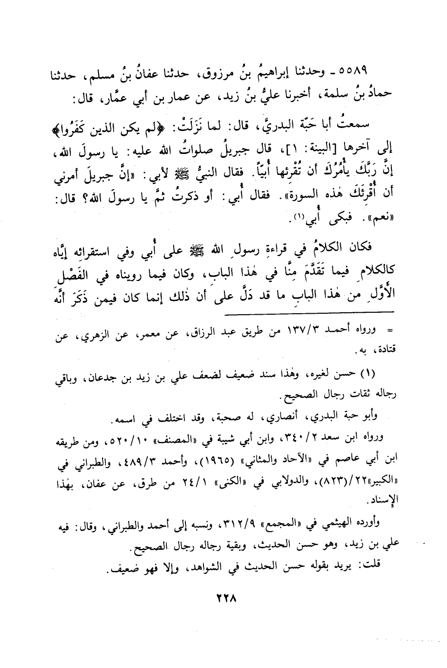 5589 - وَحَدَّثَنَا إِبْرَاهِيمُ بْنُ مَرْزُوقٍ، حَدَّثَنَا عَفَّانُ بْنُ مُسْلِمٍ، حَدَّثَنَا حَمَّادُ بْنُ سَلَمَةَ، أَخْبَرَنَا عَلِيُّ بْنُ زَيْدٍ، عَنْ عَمَّارِ بْنِ أَبِي عَمَّارٍ قَالَ: سَمِعْتُ أَبَا حَبَّةَ الْبَدْرِيَّ قَالَ: لَمَّا نَزَلَتْ: لَمْ يَكُنِ الَّذِينَ كَفَرُوا، إِلَى آخِرِهَا قَالَ جِبْرِيلُ صَلَوَاتُ اللهِ عَلَيْهِ: يَا رَسُولَ اللهِ، إِنَّ رَبَّكَ يَأْمُرُكَ أَنْ تُقْرِئَهَا أُبَيًّا، فَقَالَ النَّبِيُّ صَلَّى اللَّهُ عَلَيْهِ وَسَلَّمَ لِأُبَيٍّ: " إِنَّ جِبْرِيلَ أَمَرَنِي أَنْ أُقْرِئَكَ هَذِهِ السُّورَةَ "، فَقَالَ أُبَيٌّ: أَوَذُكِرْتُ ثَمَّ يَا رَسُولَ اللهِ؟ قَالَ: " نَعَمْ "، فَبَكَى أُبَيٌّ " فَكَانَ الْكَلَامُ فِي قِرَاءَةِ رَسُولِ اللهِ صَلَّى اللَّهُ عَلَيْهِ وَسَلَّمَ عَلَى أُبَيٍّ، وَفِي اسْتِقْرَائِهِ إِيَّاهُ، كَالْكَلَامِ فِيمَا تَقَدَّمَ مِنَّا فِي هَذَا الْبَابِ، وَكَانَ فِيمَا رَوَيْنَاهُ فِي الْفَصْلِ الْأَوَّلِ مِنْ هَذَا الْبَابِ مَا قَدْ دَلَّ عَلَى أَنَّ ذَلِكَ إِنَّمَا كَانَ فِيمَنْ ذَكَرَ أَنَّهُ -[229]- كَانَ فِي كُلِّ الْقُرْآنِ، وَهَذَا مِمَّا قَدْ يَجُوزُ فِي اللُّغَةِ أَنْ يُذْكَرَ الْقُرْآنُ، وَالْمُرَادُ بِهِ بَعْضُهُ كَمَا يَقُولُ الرَّجُلُ: سَمِعْتُ فُلَانًا يَقْرَأُ الْقُرْآنَ: إِذَا سَمِعَهُ يَقْرَأُ شَيْئًا مِنْهُ، وَإِنْ لَمْ يَسْمَعْهُ يَقْرَؤُهُ كُلَّهُ، وَمِنْ ذَلِكَ قَوْلُ اللهِ عَزَّ وَجَلَّ: {فَإِذَا قَرَأْتَ الْقُرْآنَ فَاسْتَعِذْ بِاللهِ مِنَ الشَّيْطَانِ الرَّجِيمِ} [النحل: 98] ، فَكَانَ ذَلِكَ عَلَى مَنْ يُرِيدُ قِرَاءَةَ الْقُرْآنِ، وَعَلَى مَنْ يُرِيدُ قِرَاءَةَ شَيْءٍ مِنْهُ، وَإِنْ لَمْ يَقْرَأْهُ كُلَّهُ. فَإِنْ قَالَ قَائِلٌ: فَهَلْ وَجَدْتُمْ لِأَصْحَابِ رَسُولِ اللهِ صَلَّى اللَّهُ عَلَيْهِ وَسَلَّمَ الَّذِينَ كَانُوا جَمَعُوا الْقُرْآنَ مِنَ الرُّتْبَةِ فِي الْقُرْآنِ مِثْلَ الَّذِي كَانَ لِأُبَيٍّ فِيهَا؟ فَكَانَ جَوَابَنَا لَهُ فِي ذَلِكَ: أَنَّا قَدْ وَجَدْنَا لِعَبْدِ اللهِ بْنِ مَسْعُودٍ مِثْلَ مَا وَجَدْنَا لِأُبَيٍّ فِيهِ، وَزِيَادَةً عَلَيْهِ، فَإِنَّ الْقِرَاءَةَ الَّتِي سَمِعَهَا مِنْ رَسُولِ اللهِ صَلَّى اللَّهُ عَلَيْهِ وَسَلَّمَ كَانَتْ مِنْهُ عَلَى جِبْرِيلَ صَلَوَاتُ اللهِ عَلَيْهِ، وَإِنَّهَا لِلْقُرْآنِ كُلِّهِ، وَالَّذِي يَحْضُرُهُ أُبَيٌّ مِمَّا ذَكَرْنَا حُضُورَهُ إِيَّاهُ مِنْ رَسُولِ اللهِ صَلَّى اللَّهُ عَلَيْهِ وَسَلَّمَ لَمْ يَكُنْ مِثْلَ ذَلِكَ، إِنَّمَا كَانَ يُقْرِئُهُ سُورَةً مِنَ الْقُرْآنِ , لَا عَلَى جِبْرِيلَ صَلَوَاتُ اللهِ عَلَيْهِ