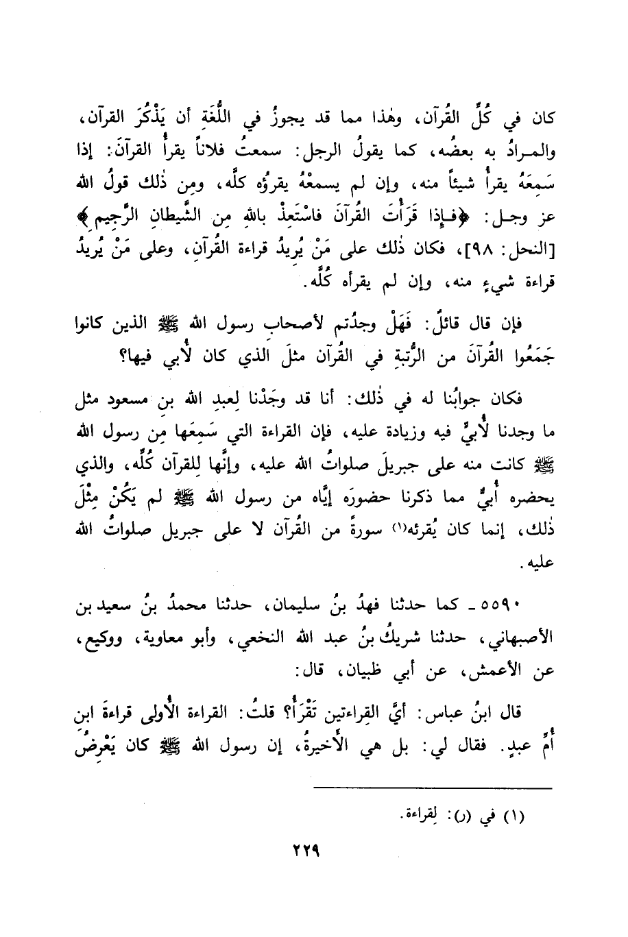 5590 - كَمَا حَدَّثَنَا فَهْدُ بْنُ سُلَيْمَانَ، حَدَّثَنَا مُحَمَّدُ بْنُ سَعِيدِ بْنِ الْأَصْبَهَانِيِّ، حَدَّثَنَا شَرِيكُ بْنُ عَبْدِ اللهِ النَّخَعِيُّ، وَأَبُو مُعَاوِيَةَ، وَوَكِيعٌ، عَنِ الْأَعْمَشِ، عَنْ أَبِي ظَبْيَانَ قَالَ: قَالَ ابْنُ عَبَّاسٍ: " أَيُّ الْقِرَاءَتَيْنِ تَقْرَأُ؟، قُلْتُ: الْقِرَاءَةَ الْأُولَى , قِرَاءَةَ ابْنِ أُمِّ عَبْدٍ، فَقَالَ لِي: بَلْ هِيَ الْأَخِيرَةُ، إِنَّ رَسُولَ اللهِ صَلَّى اللَّهُ عَلَيْهِ وَسَلَّمَ كَانَ يَعْرِضُ -[230]- الْقُرْآنَ عَلَى جِبْرِيلَ فِي كُلِّ عَامٍ مَرَّةً، فَلَمَّا كَانَ فِي الْعَامِ الَّذِي قُبِضَ، عَرَضَهُ مَرَّتَيْنِ عَلَيْهِ، فَحَضَرَ ذَلِكَ عَبْدُ اللهِ بْنُ مَسْعُودٍ، فَعَلِمَ مَا نُسِخَ وَمَا بُدِّلَ " فَكَانَ فِي هَذَا الْحَدِيثِ حُضُورُ عَبْدِ اللهِ بْنِ مَسْعُودٍ لِلْقِرَاءَةِ الَّتِي قَرَأَهَا رَسُولُ اللهِ صَلَّى اللَّهُ عَلَيْهِ وَسَلَّمَ عَلَى جِبْرِيلَ وَنَحْنُ نُحِيطُ عِلْمًا أَنَّهُ صَلَّى اللَّهُ عَلَيْهِ وَسَلَّمَ لَمْ يُبْلِغِ ابْنَ مَسْعُودٍ تِلْكَ الرُّتْبَةَ إِلَّا بِأَمْرِ اللهِ إِيَّاهُ أَنْ يُبْلِغَهُ إِيَّاهَا. مَعَ أَنَّا قَدْ نَظَرْنَا فِي الْحَدِيثِ الَّذِي رَوَاهُ هَمَّامٌ، عَنْ قَتَادَةَ، عَنْ أَنَسٍ الَّذِي قَدْ ذَكَرْنَاهُ فِي الْفَصْلِ الَّذِي قَبْلَ الْفَصْلِ مِنْ هَذَا الْبَابِ، فَوَجَدْنَا مَنْ هُوَ فَوْقَ هَمَّامٍ مِنْ أَصْحَابِ قَتَادَةَ، وَهُوَ سَعِيدُ بْنُ أَبِي عَرُوبَةَ قَدْ خَالَفَ هَمَّامًا فِي إِسْنَادِهِ