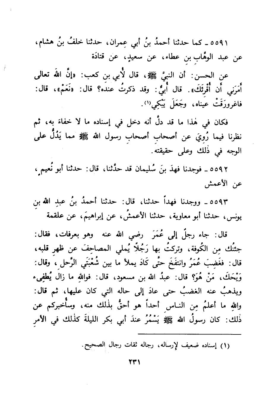 5593 - وَوَجَدْنَا فَهْدًا حَدَّثَنَا قَالَ: حَدَّثَنَا أَحْمَدُ بْنُ عَبْدِ اللهِ بْنِ يُونُسَ، حَدَّثَنَا أَبُو مُعَاوِيَةَ، حَدَّثَنَا الْأَعْمَشُ، عَنْ إِبْرَاهِيمَ، عَنْ عَلْقَمَةَ قَالَ: جَاءَ رَجُلٌ إِلَى عُمَرَ رَضِيَ اللهُ عَنْهُ وَهُوَ بِعَرَفَاتٍ، فَقَالَ: جِئْتُكَ مِنَ الْكُوفَةِ، وَتَرَكْتُ بِهَا رَجُلًا يُمْلِي الْمَصَاحِفَ عَنْ ظَهْرِ قَلْبِهِ قَالَ: فَغَضِبَ عُمَرُ، وَانْتَفَخَ حَتَّى كَادَ يَمْلَأُ مَا بَيْنَ شُعْبَتَيِ الرَّحْلِ، وَقَالَ: وَيْحَكَ، مَنْ هُوَ؟ قَالَ: عَبْدُ اللهِ بْنُ مَسْعُودٍ قَالَ: فَوَاللهِ مَا زَالَ يُطْفِئُ وَيَذْهَبُ عَنْهُ الْغَضَبُ حَتَّى عَادَ إِلَى حَالِهِ الَّتِي كَانَ عَلَيْهَا، ثُمَّ قَالَ: وَاللهِ مَا أَعْلَمُ مِنَ النَّاسِ أَحَدًا هُوَ أَحَقُّ بِذَلِكَ مِنْهُ، وَسَأُخْبِرُكُمْ عَنْ ذَلِكَ: كَانَ رَسُولُ اللهِ صَلَّى اللَّهُ عَلَيْهِ وَسَلَّمَ يَسْمُرُ عِنْدَ أَبِي بَكْرٍ اللَّيْلَةَ كَذَلِكَ فِي الْأَمْرِ -[232]- مِنْ أُمُورِ الْمُسْلِمِينَ، وَأَنَّهُ سَمَرَ عِنْدَهُ ذَاتَ لَيْلَةٍ وَأَنَا مَعَهُ قَالَ: ثُمَّ خَرَجَ رَسُولُ اللهِ صَلَّى اللَّهُ عَلَيْهِ وَسَلَّمَ، وَخَرَجْنَا مَعَهُ، فَلَمَّا دَخَلَ الْمَسْجِدَ إِذَا رَجُلٌ قَائِمٌ يُصَلِّي، فَقَامَ رَسُولُ اللهِ صَلَّى اللَّهُ عَلَيْهِ وَسَلَّمَ يَسْتَمِعُ قِرَاءَتَهُ , فَمَا كِدْنَا نَعْرِفُ الرَّجُلَ , قَالَ رَسُولُ اللهِ صَلَّى اللَّهُ عَلَيْهِ وَسَلَّمَ: " مَنْ سَرَّهُ أَنْ يَقْرَأَ الْقُرْآنَ رَطْبًا كَمَا أُنْزِلَ، فَلْيَقْرَأْهُ عَلَى قِرَاءَةِ ابْنِ أُمِّ عَبْدٍ "، ثُمَّ جَلَسَ الرَّجُلُ يَدْعُو، فَقَالَ رَسُولُ اللهِ صَلَّى اللَّهُ عَلَيْهِ وَسَلَّمَ: " سَلْ تُعْطَهْ، سَلْ تُعْطَهْ "، فَقُلْتُ: وَاللهِ لَأَغْدُوَنَّ إِلَيْهِ، وَلَأُبَشِّرَنَّهُ، فَغَدَوْتُ إِلَيْهِ، فَوَجَدْتُ أَبَا بَكْرٍ قَدْ سَبَقَنِي إِلَيْهِ فَبَشَّرَهُ، وَلَا وَاللهِ مَا سَبَقْتُهُ إِلَى خَيْرٍ إِلَّا سَبَقَنِي إِلَيْهِ ,