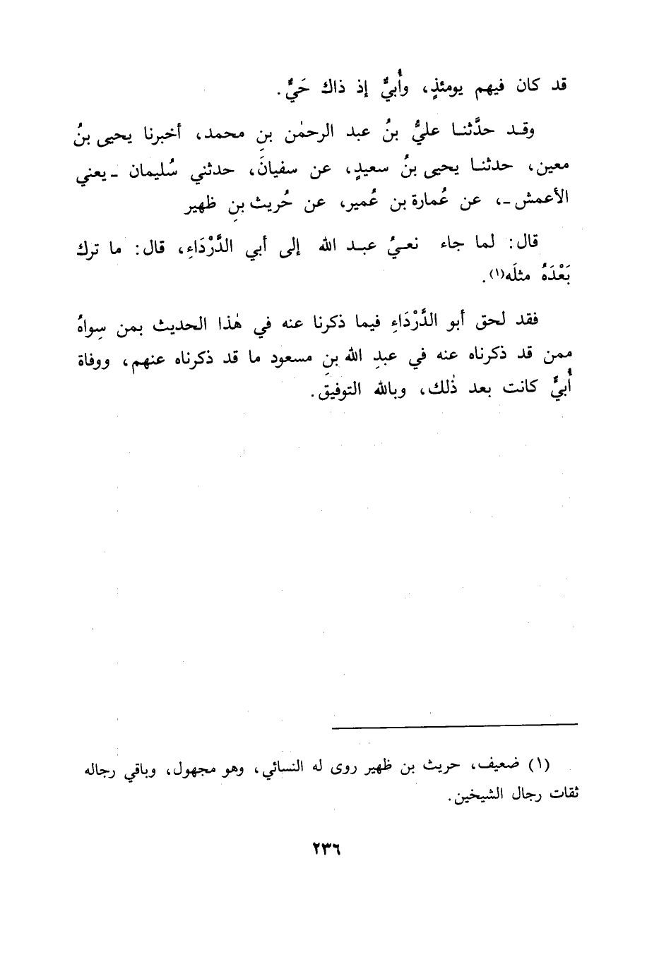 وَقَدْ حَدَّثَنَا عَلِيُّ بْنُ عَبْدِ الرَّحْمَنِ بْنِ مُحَمَّدٍ، أَخْبَرَنَا يَحْيَى بْنُ مَعِينٍ، حَدَّثَنَا يَحْيَى بْنُ سَعِيدٍ، عَنْ سُفْيَانَ، حَدَّثَنِي سُلَيْمَانُ - يَعْنِي الْأَعْمَشَ، عَنْ عُمَارَةَ بْنِ عُمَيْرٍ، عَنْ حُرَيْثِ بْنِ ظُهَيْرٍ قَالَ: لَمَّا جَاءَ نَعْيُ عَبْدِ اللهِ إِلَى أَبِي الدَّرْدَاءِ قَالَ: " مَا تَرَكَ بَعْدَهُ مِثْلَهُ " فَقَدْ لَحِقَ أَبُو الدَّرْدَاءِ فِيمَا ذَكَرْنَا عَنْهُ فِي هَذَا الْحَدِيثِ بِمَنْ سِوَاهُ مِمَّنْ قَدْ ذَكَرْنَاهُ عَنْهُ فِي عَبْدِ اللهِ بْنِ مَسْعُودٍ مَا قَدْ ذَكَرْنَاهُ عَنْهُمْ. وَوَفَاةُ أُبَيٍّ كَانَتْ بَعْدَ ذَلِكَ، وَبِاللهِ التَّوْفِيقُ